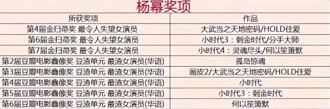 她也因此三次獲得“金掃帚影后”,五次獲得豆瓣網“最渣華語女演員。”