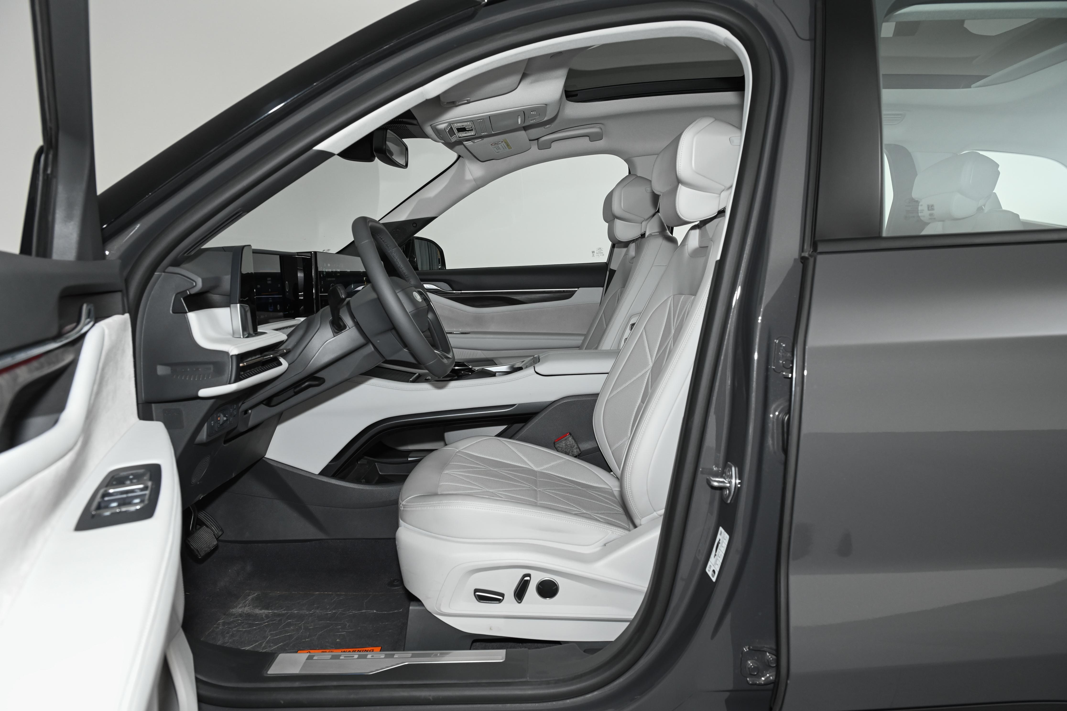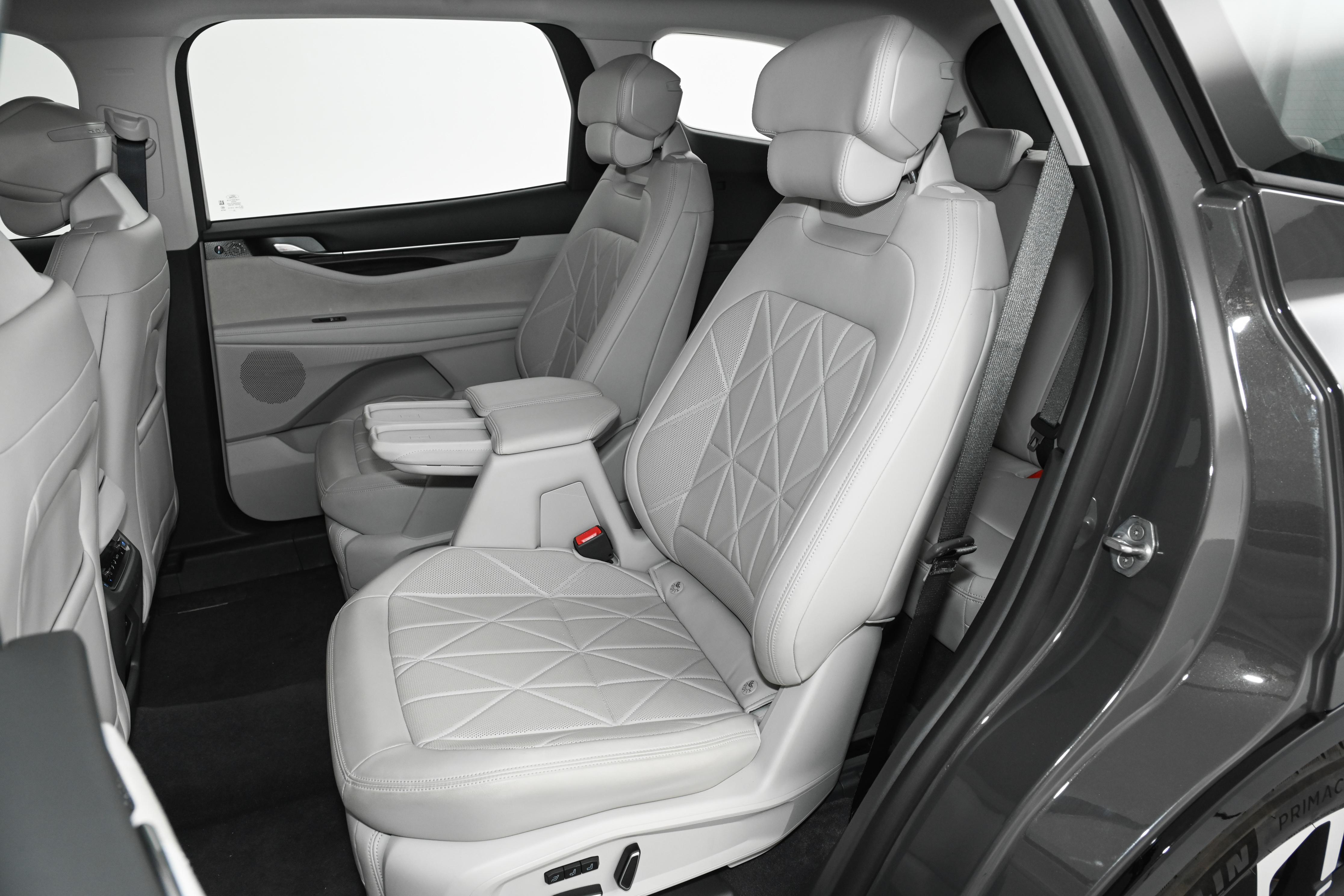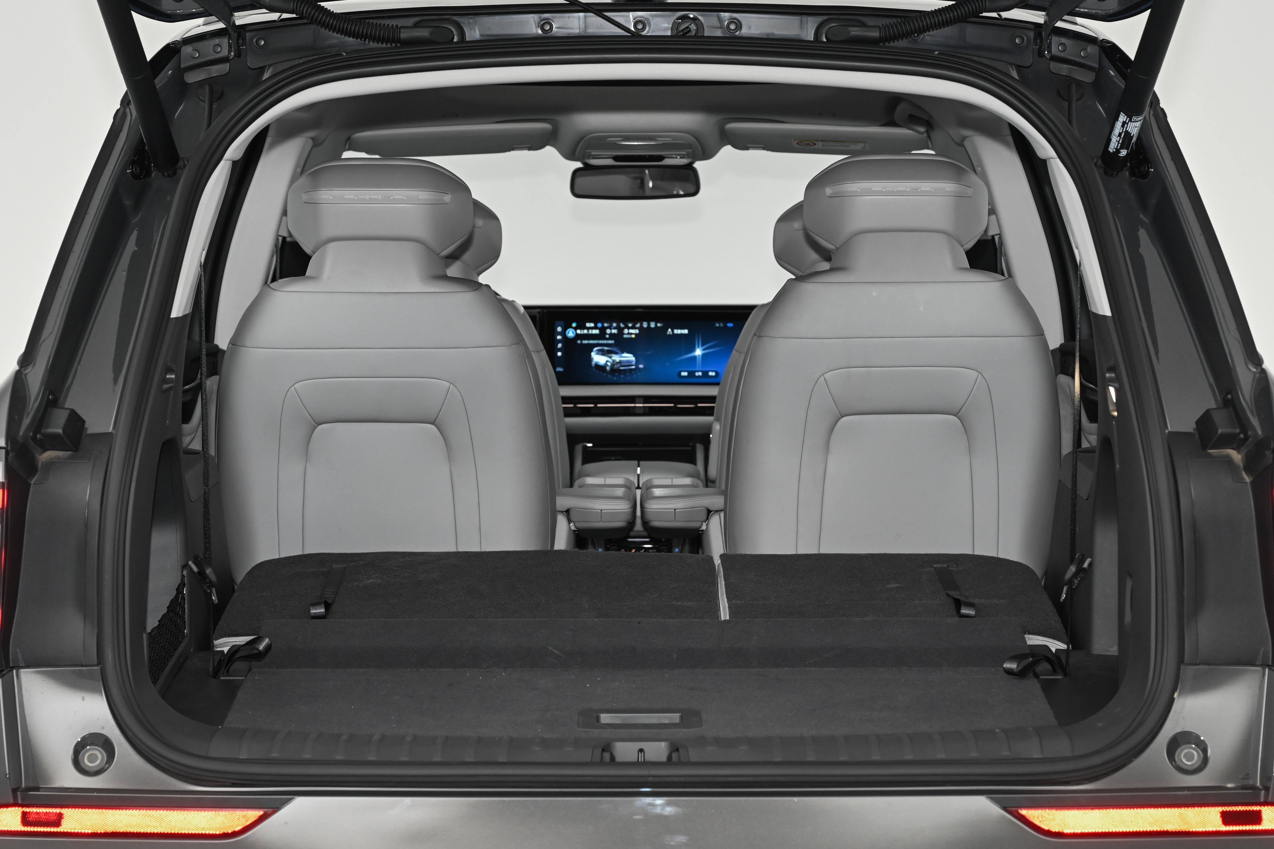 空間表現:這款車的亮點是真三排,三排不再是“小板凳”。這車長5米,車寬1.961米,車高1.773米,軸距達到2.95米,這樣的尺寸擺在那裏,空間自然不會小。它的核心優勢是第三排真的能坐人。它採用2+2+3的佈局,第二排獨立座椅,中間有個20釐米寬的通道。座椅後仰角度可達41°,腿託抬升50°,瞬間進入零重力狀態,長途旅行也能得到極致的放鬆。二排中央預留200mm寬的通道,成年人不用費力摺疊座椅,側身就可以輕鬆進入第三排,老人孩子也可以輕鬆穿行,比起很多需要“鑽”進去的七座SUV方便太多了。第三排的腿部空間達到了759mm,坐墊高度有35釐米,比漢蘭達還高一點,大腿可以得到有效支撐,不會像做小板凳一樣懸空。成年人坐進去也不會覺得憋屈,徹底告別了傳統七座SUV第三排“小板凳”的尷尬。還有靠背角度也可以調節,長途坐個把小時也不會太難受。全車共有20多處儲物格,手機、水杯、紙巾都可以歸置得整整齊齊。後備箱常規容積309L,可以放置一個28寸行李箱加嬰兒車,全家短途旅行完全夠用。如果把第三排放倒,容積可以瞬間拓展到969L,搬家拉貨都不在話下。
