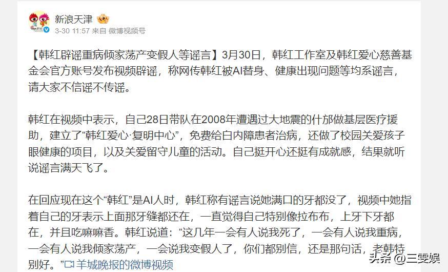 “韓紅已被替換”、“韓紅失聯多日”、“韓紅牙齒全被打掉”。