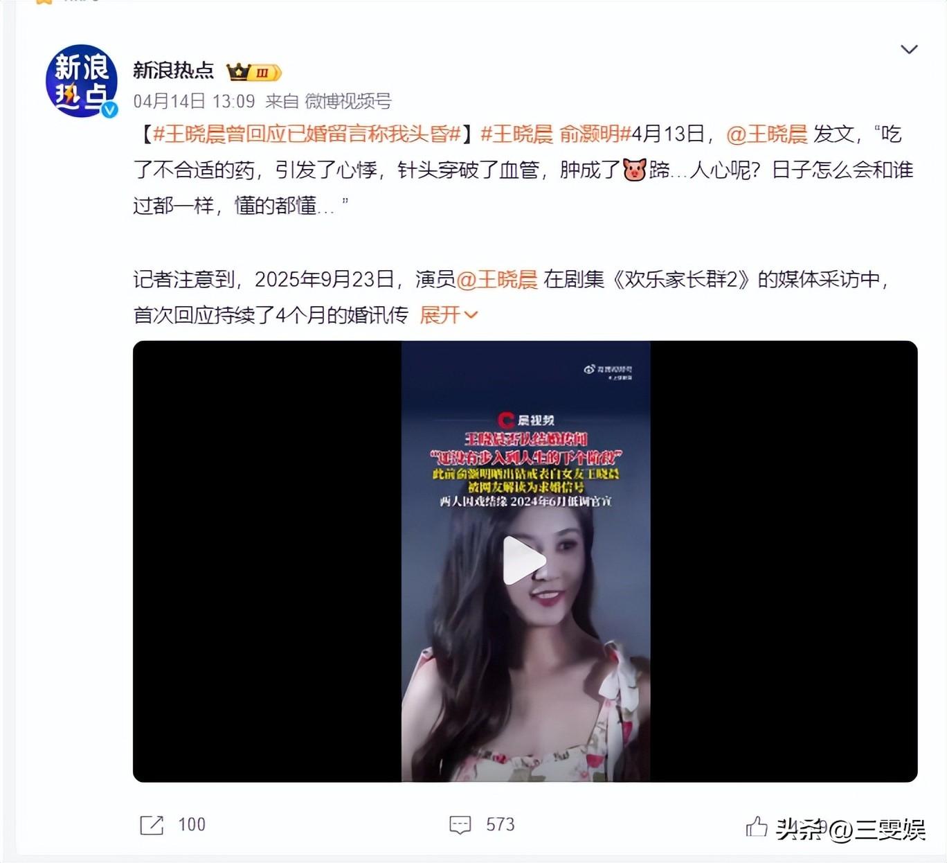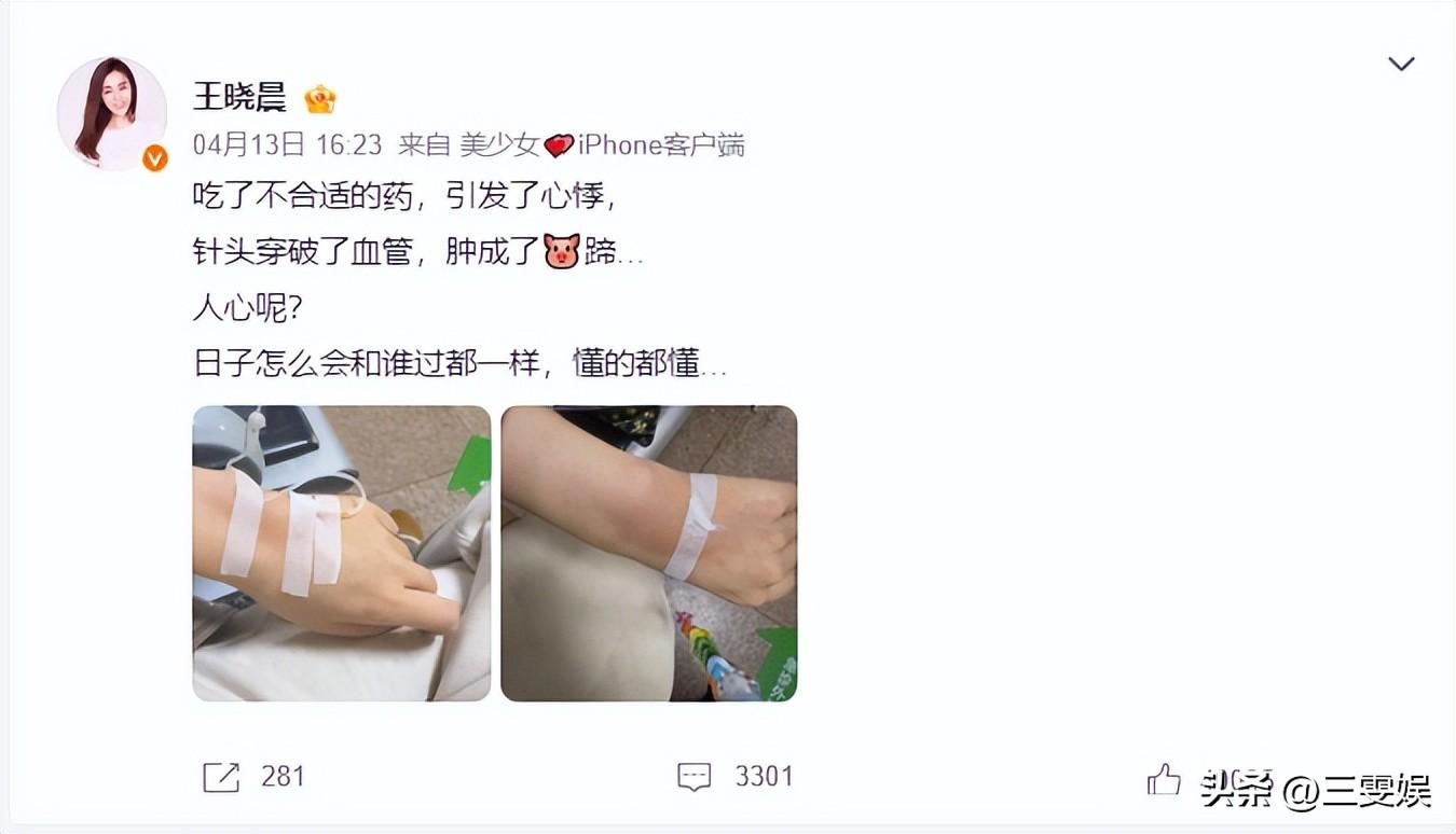 2026年4月13號,王曉晨發文說自己喫錯藥心悸,輸液腫了手臂。