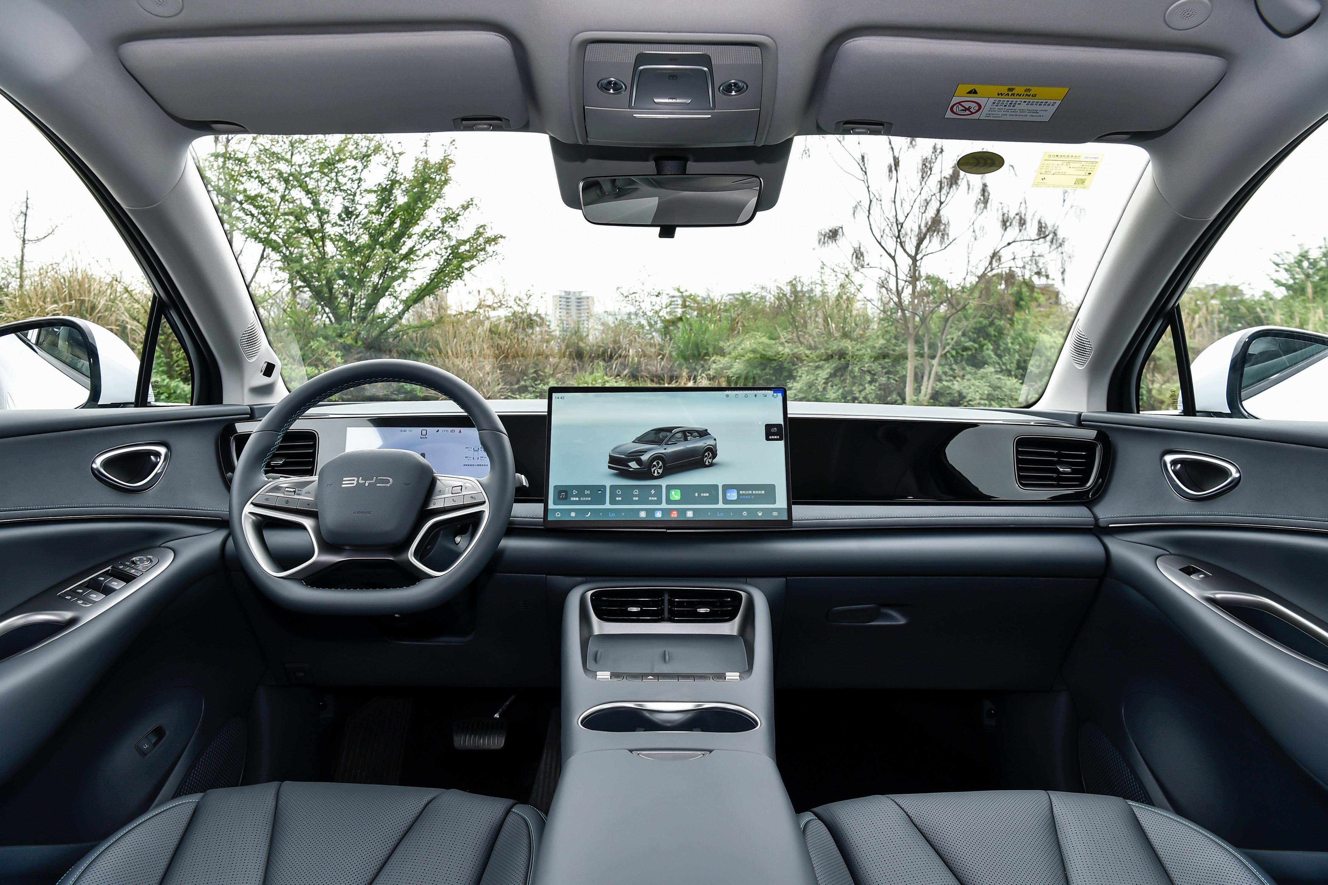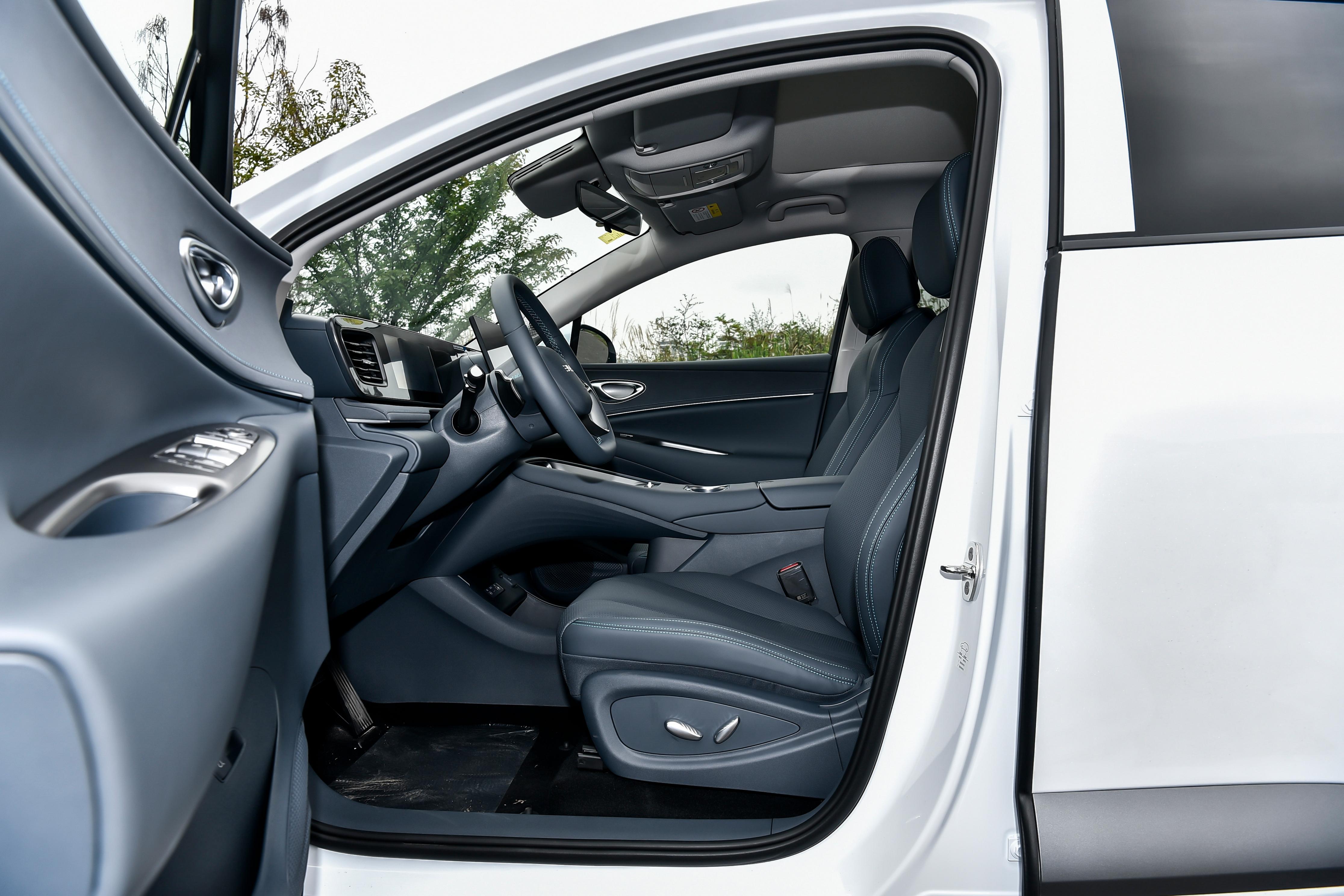 內飾方面:車內採用皮質多功能雙色方向盤,搭配電子換擋換擋形式,操作便捷且節省車內空間。座椅採用仿皮材質,主副駕標配電動調節,前排座椅具備加熱、通風、記憶功能,乘坐舒適性表現良好。車內配備不可開啓全景天窗,搭配全景天幕遮陽簾,採光效果出色,同時還能比避免陽光直射。前排多層隔音玻璃、後排隱私玻璃,可以有效降低外界噪音干擾,提高車內靜謐性。空調爲雙區聰明空調,支持後排獨立出風口,車內PM2.5過濾裝置爲標配,可以優化車內空間質量,讓駕乘更加健康舒適。