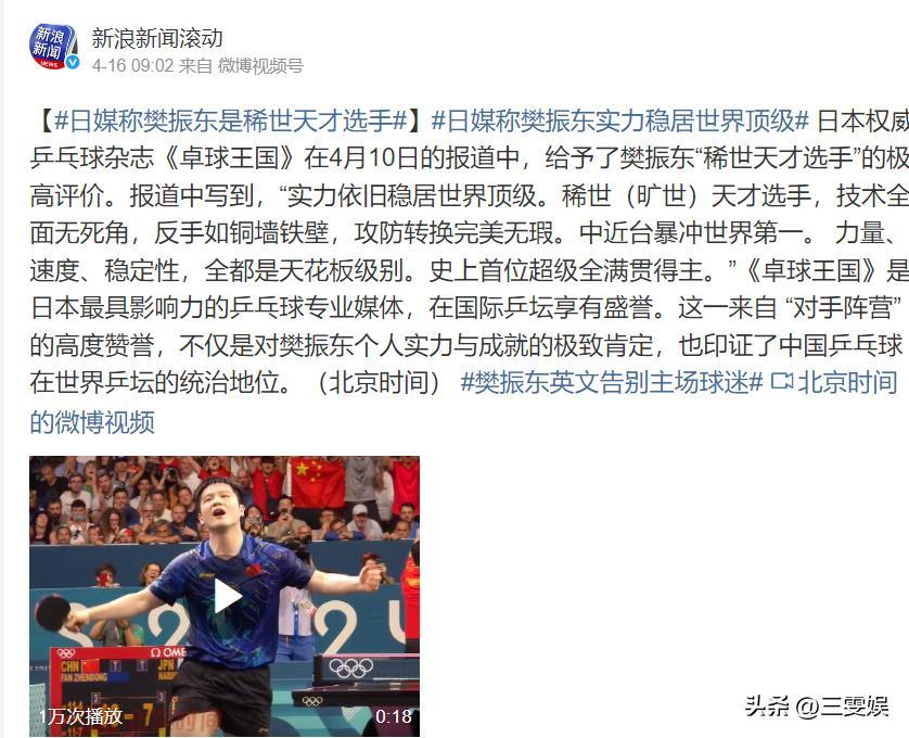 新浪新聞滾動——【#日媒稱樊振東是稀世天才選手#】