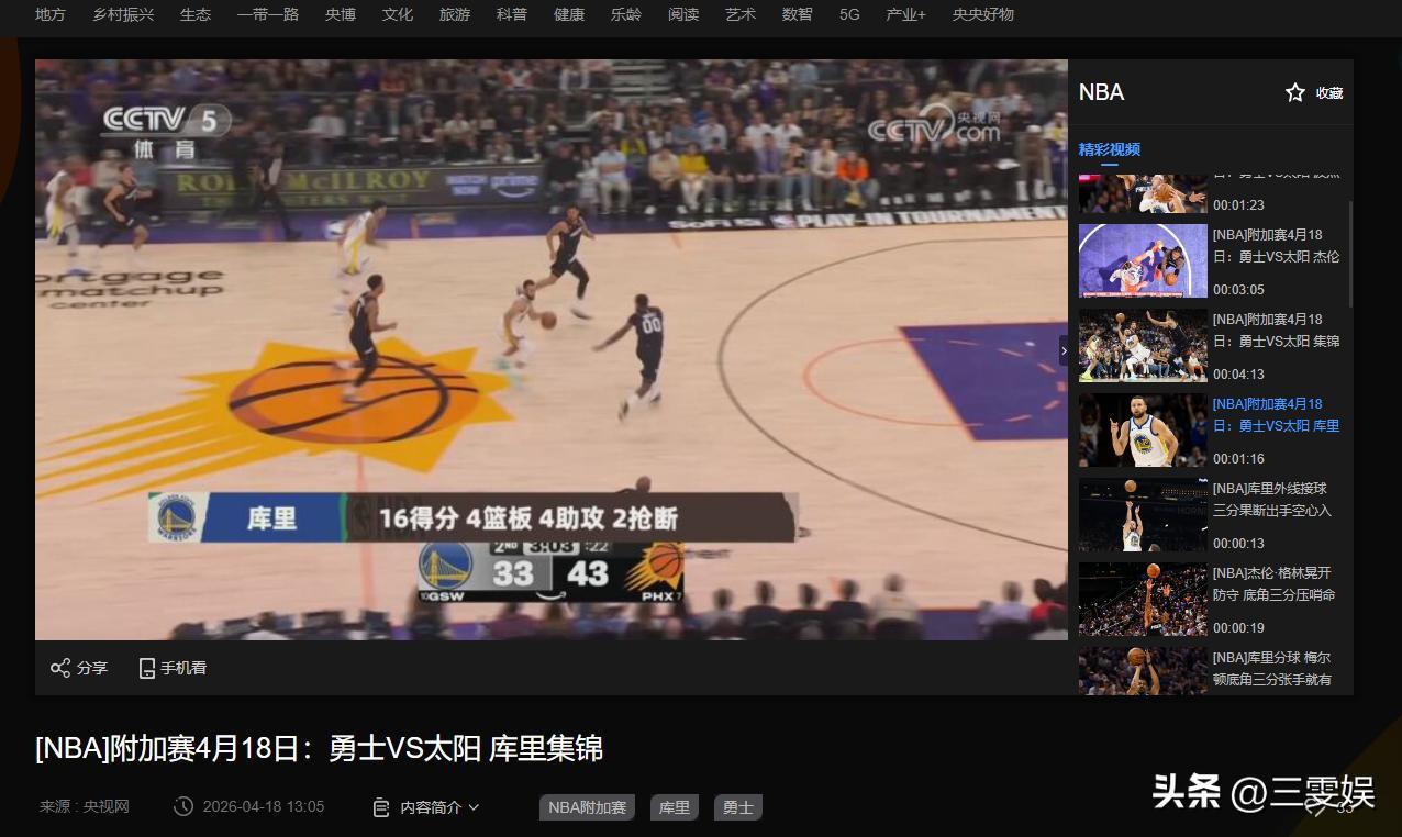 央視網——[NBA]附加賽4月18日:勇士VS太陽 庫裏集錦