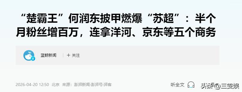 藍鯨新聞——“楚霸王”何潤東披甲燃爆“蘇超”:半個月粉絲增百萬,連拿洋河、京東等五個商務