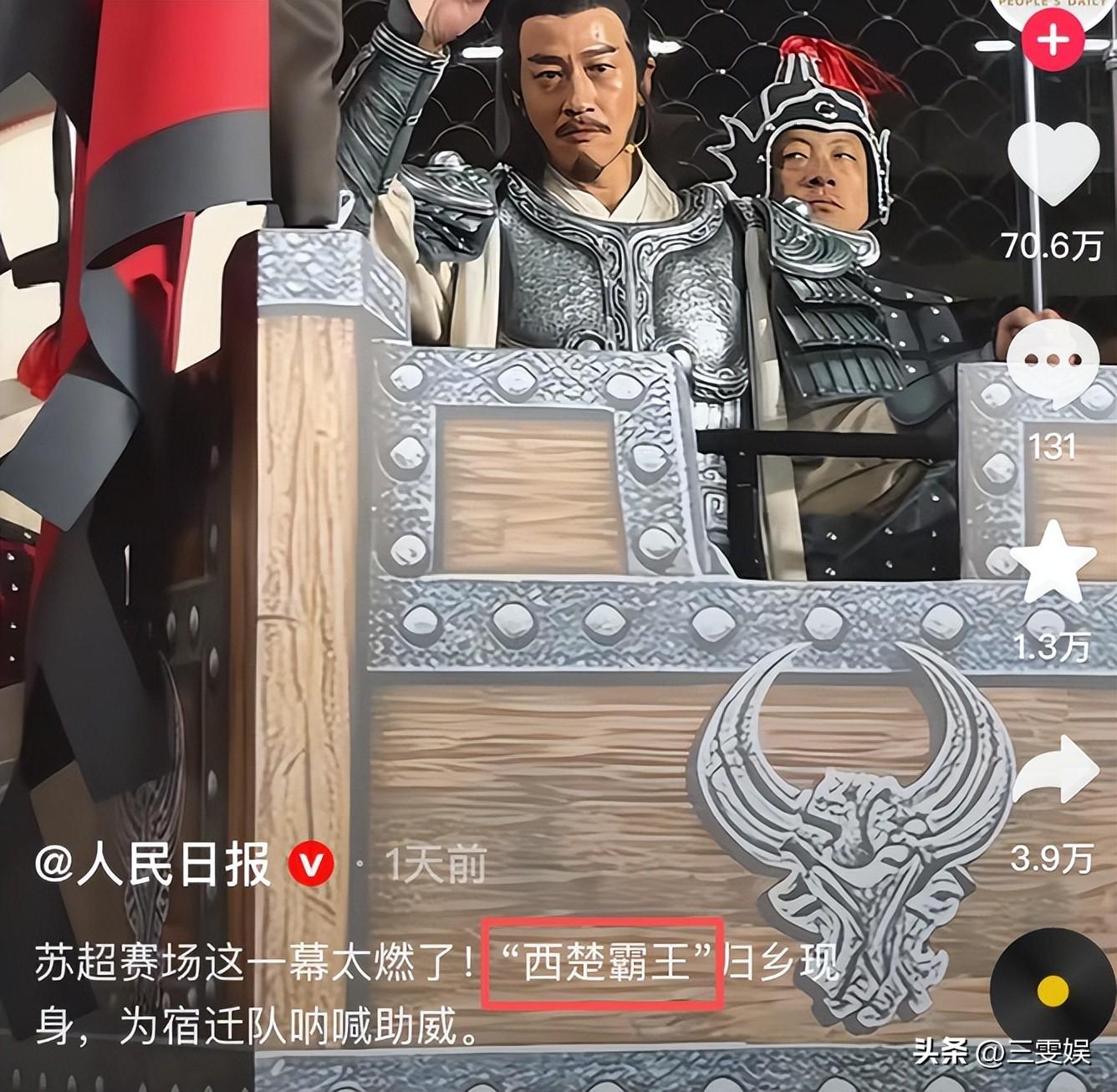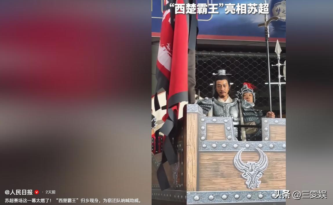 人民日報——蘇超賽場這一幕太燃了!“西楚霸王”歸鄉現身,爲宿遷隊吶喊助威。