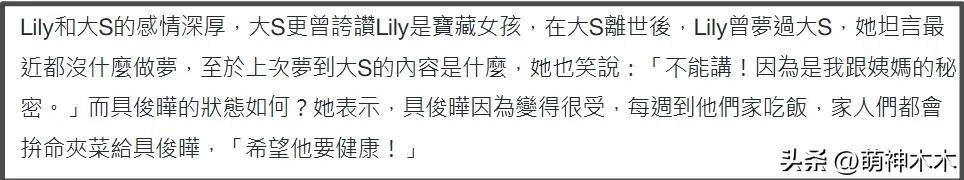 最近S家和汪小菲一家又隔空對上了!小S二女兒Lily現身參加活動,採訪時挨個提及家人,從媽媽小S聊到姐姐Elly,更不忘透露姨父具俊曄近況,自曝具俊曄每週都去她家喫飯。