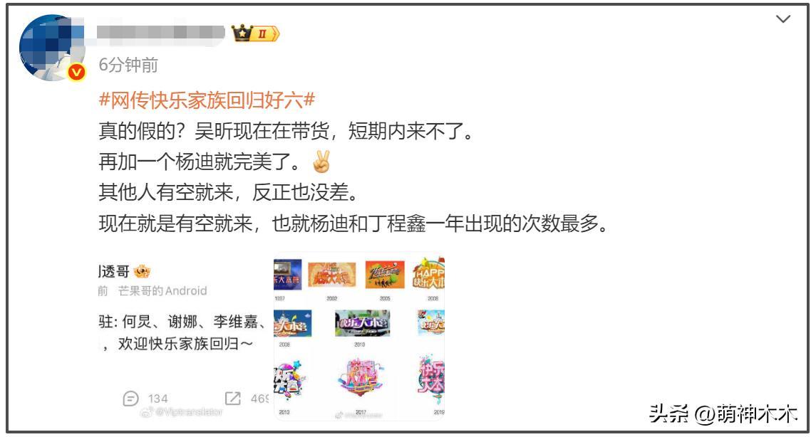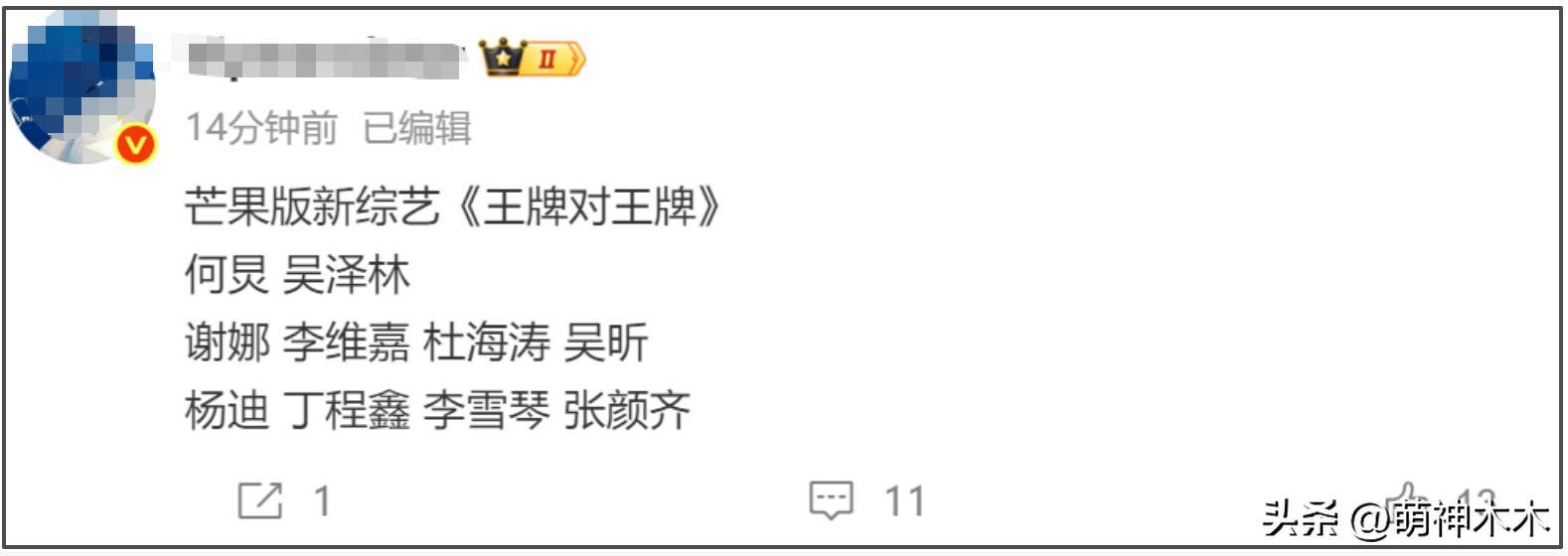 隨後經常爆料芒果臺消息的博主,突然又放出消息,表示快樂家族將做一個芒果版新綜藝《王牌對王牌》,主持人有快樂家族,還有吳澤林、楊迪、丁程鑫、李雪琴、張顏齊等,這次爆料帶上了吳昕。
