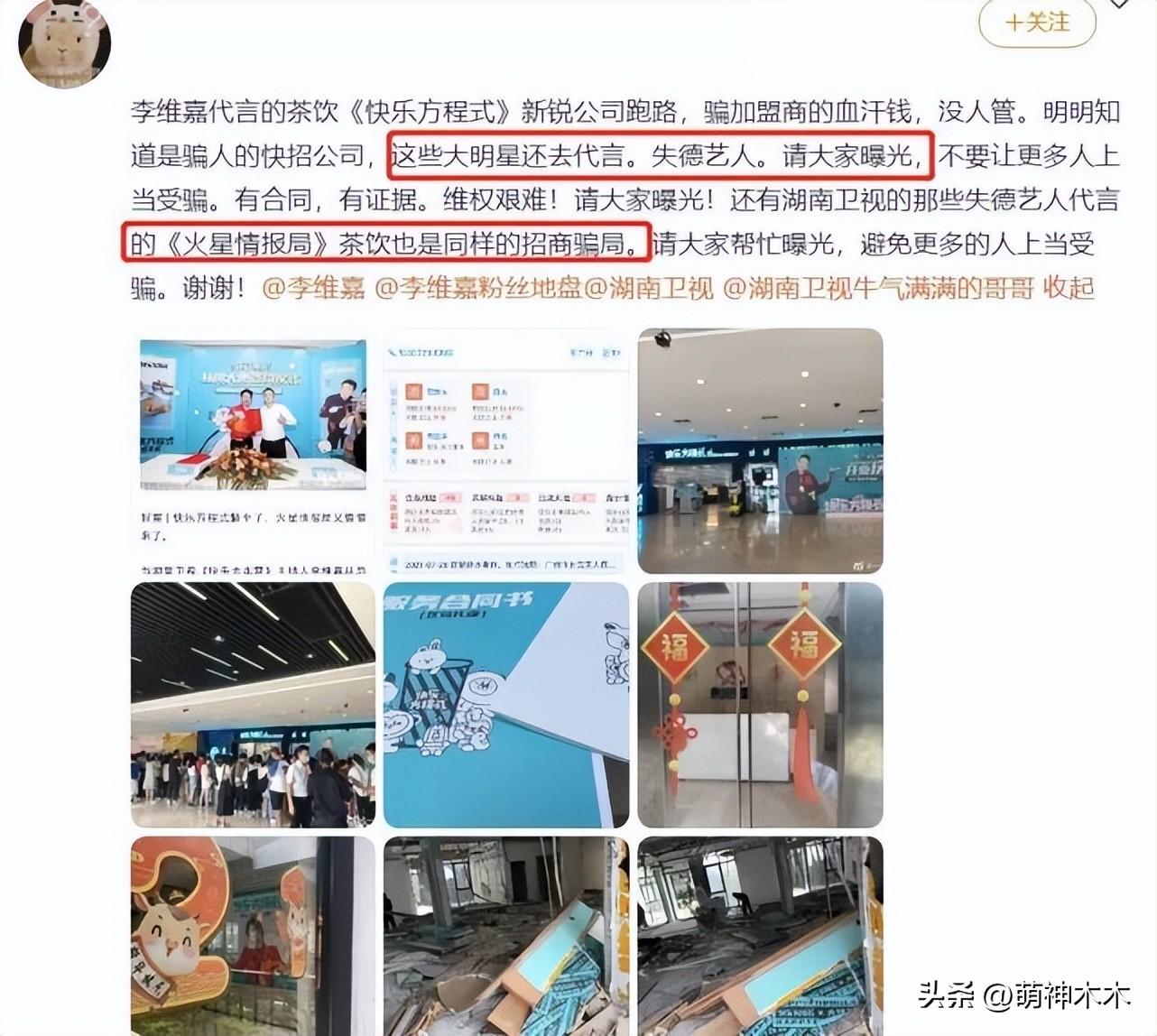 李維嘉代言的“快樂方程式”公司跑路騙加盟商血汗錢,李維嘉作爲代言人被加盟商討伐,於是就出現了加盟商集體跑到湖南廣播門口拉橫幅那一幕。有網友可能要說了,李維嘉代言而已,但是在宣傳片中,李維嘉將相關產品跟節目捆綁,有利用節目引流的嫌疑。