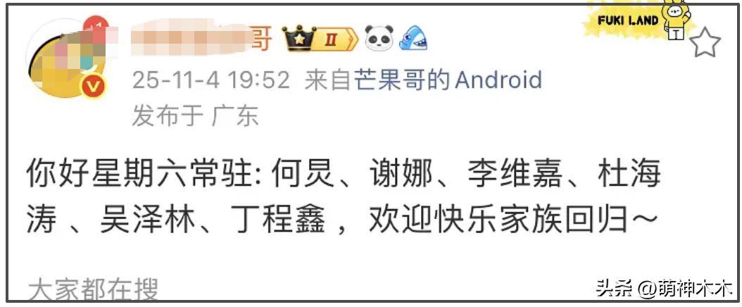 最先爆料的營銷號稱,《你好星期六》的常駐變成了何炅、謝娜、李維嘉、杜海濤、吳澤林、丁程鑫,快樂家族迴歸。