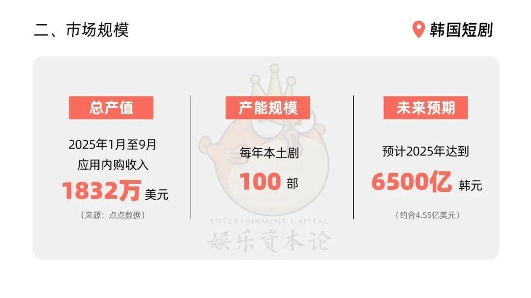 點點數據顯示,2025年前三季度,韓國短劇應用內購收入僅有1832萬美元,還不足日本市場的三分之一。cz.shorts負責人徐夜預計,韓國短劇用戶規模大約在100萬人左右。導演劉德甫分析,“相同的花費下,大家更願意看質量更好的網飛和迪士尼,很少願意爲了短劇花錢。”