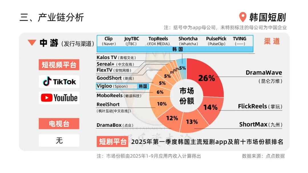 點點數據顯示,韓國短劇平臺如今已經從2024年的20多家,飆升至如今的100多家。