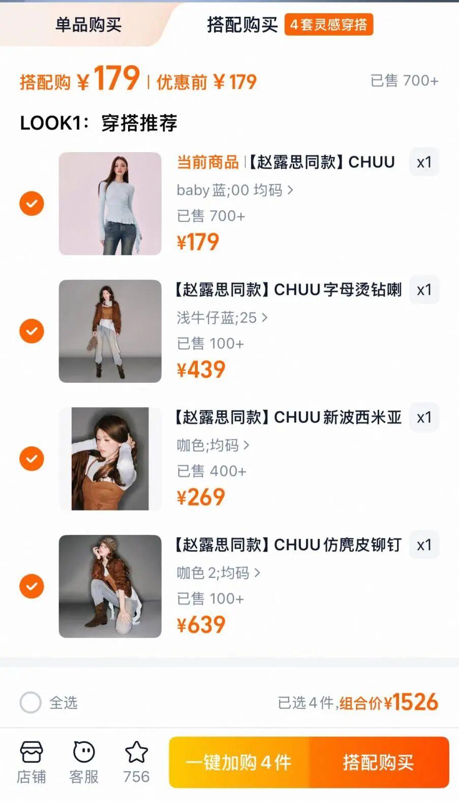 不過針對此,品牌也做了一定的價位設置。“趙露思同款”整套價格1526元,但單品最低的是內搭T恤,定價179元,該單品也是同款中銷量最高的品。