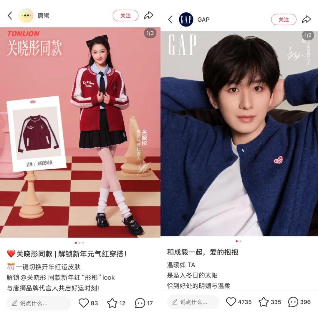 例如唐獅在2025年官宣了關曉彤爲品牌代言人,提升了品牌的國民度;H&M在2019年春節前官宣了趙麗穎和馮紹峯作爲品牌2020中國新年系列亞太地區代言人,也是二人婚後首次正式同款代言,也有效提升了品牌聲量和銷量;GAP在中國市場面臨衝擊後,通過當紅藝人成毅、高種草型藝人歐陽娜娜等合作,成功提升了品牌聲量和年輕潮款屬性。
