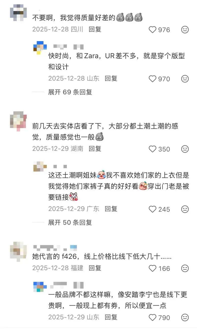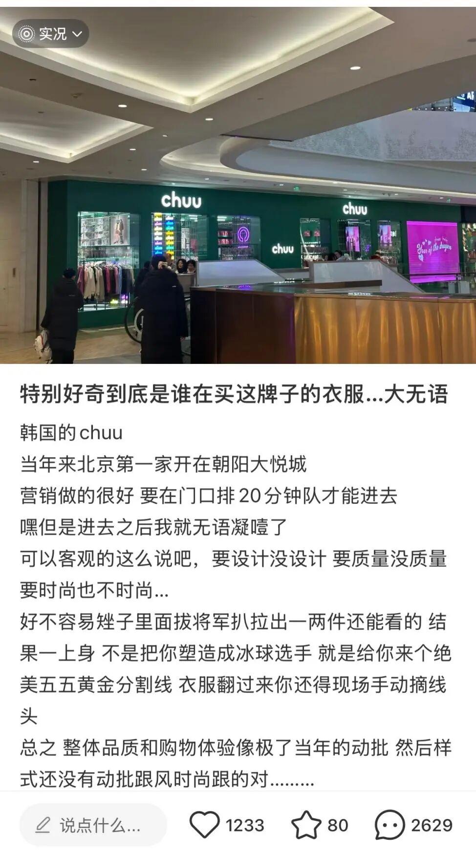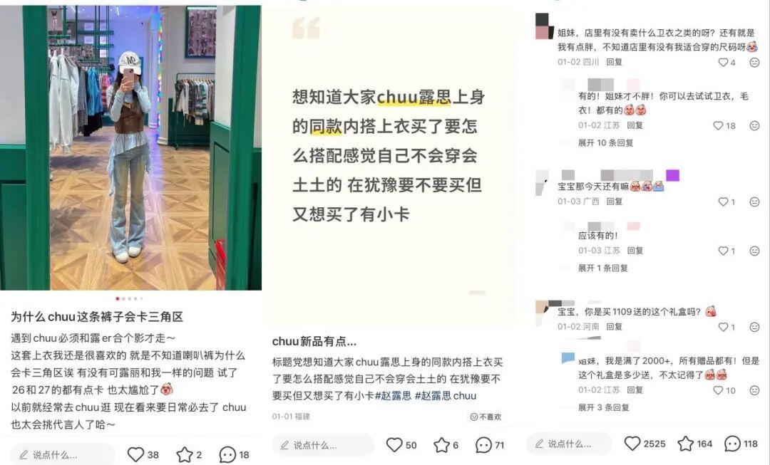 一邊是全力支持的粉絲,但另一邊也有不少粉絲無奈表示,“露思穿着很好看,但自己穿不了”、“挺好看,就是碼數實在限制人消費”。這一波熱度也引發了路人對CHUU的版型和質量爭議,不少人表示“線下買過,但版型和質量堪憂”、“之前買了好多,後來不穿了,上衣太短褲子太大”。