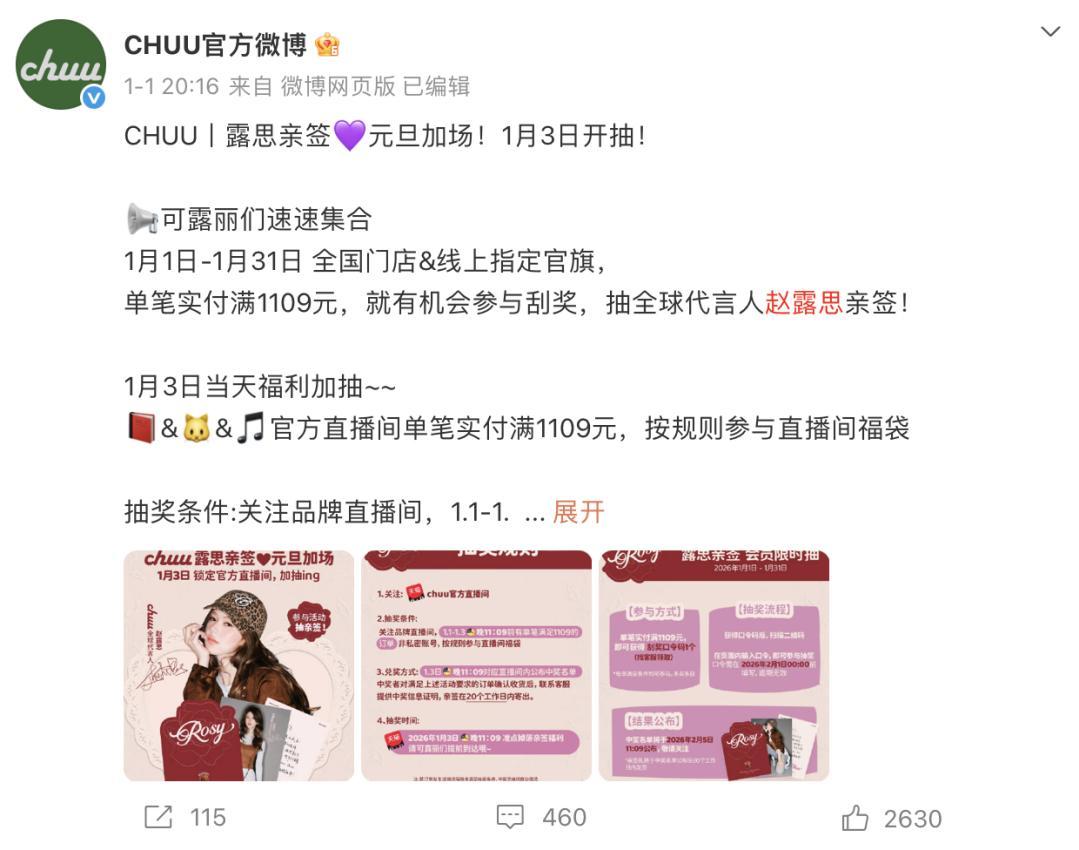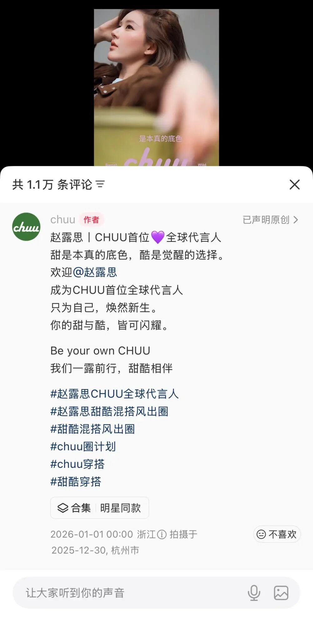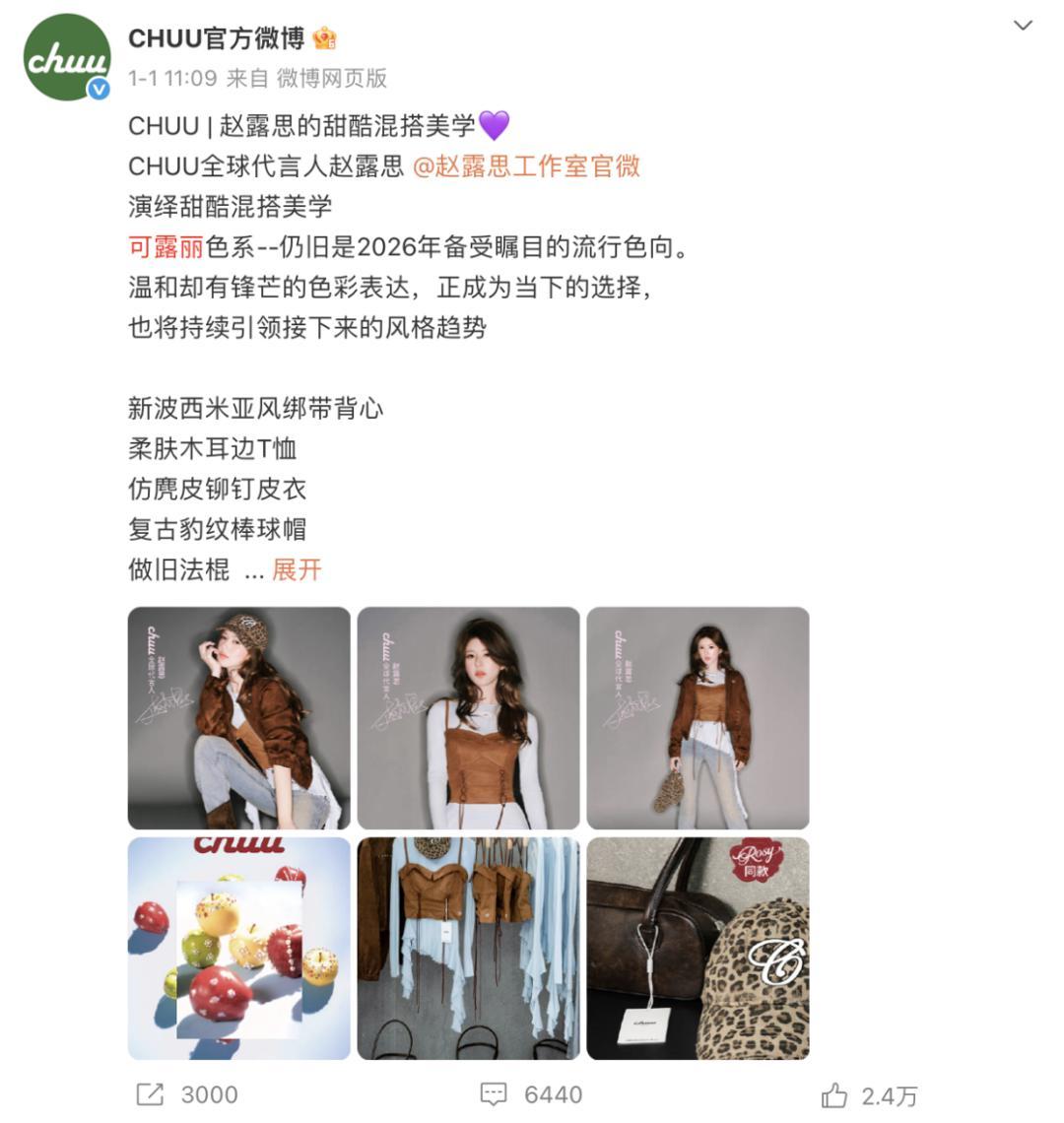 1月1日,快時尚女裝品牌CHUU官宣趙露思爲首位全球代言人。