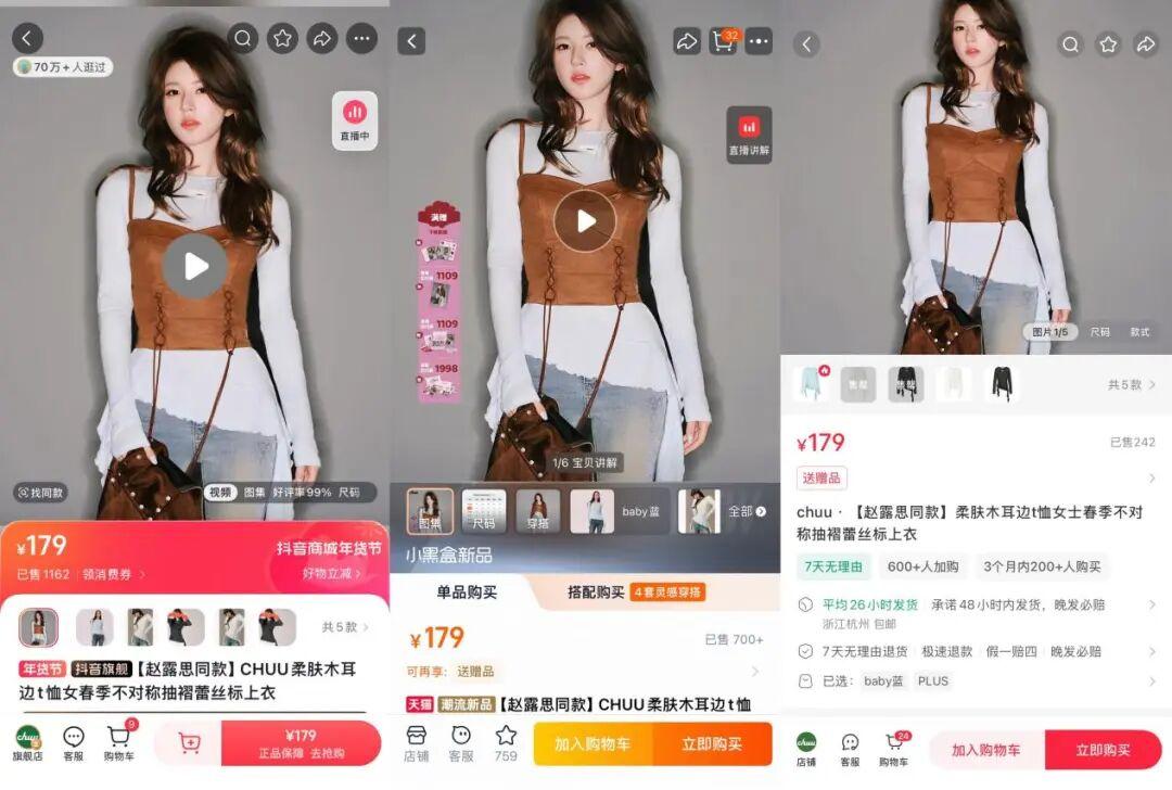 此次CHUU與趙露思合作的同款上身,打的是“露思自己搭配”的標籤,也屬於較深一些的合作方式。不過從社媒聲量、銷量來看,距離爆品還很遠。目前同款中熱度最高的是抽褶蕾絲T恤,淘寶銷量700+,小紅書售出240+件,抖音已售1000+件。