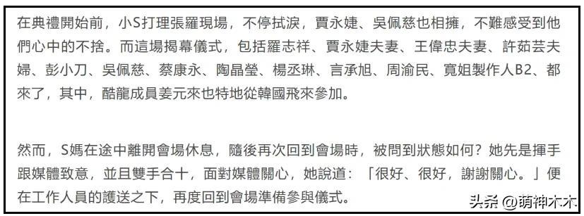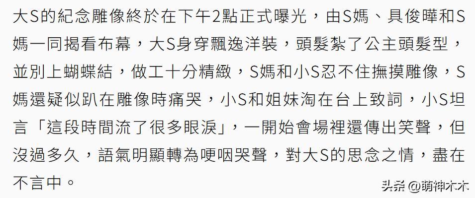 大S去世一年了,她的紀念雕像終於建成了,由S家負責舉辦儀式,包括蔡康永、吳佩慈、羅志祥、楊丞琳在內的超10位明星現身,有種給大S補辦紀念儀式的感覺,也算是彌補未能親自送別大S的遺憾吧。
