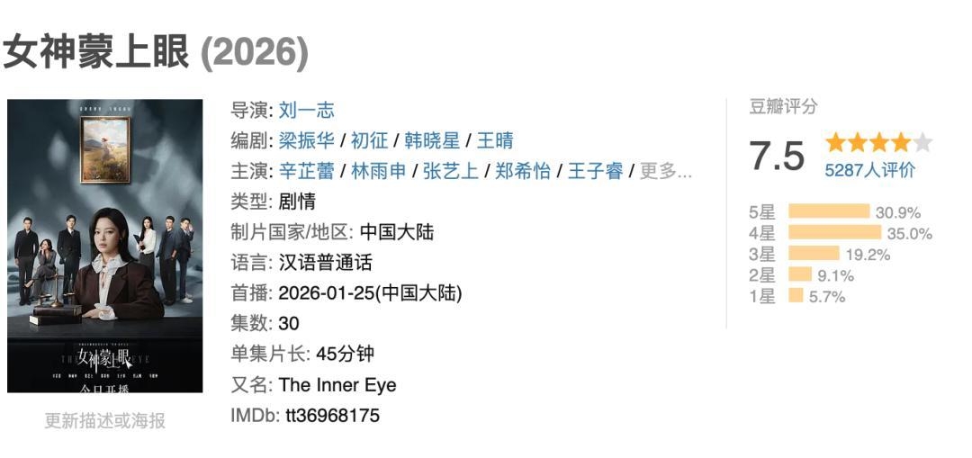 在當下的一衆律政劇當中,《女神蒙上眼》的風格創新和品質追求是顯而易見的。播出以來收視率持續奪冠,以開分7.5分的成績成爲豆瓣近年來律政題材罕見的高分,這些正是梁振華及其青春你好團隊所有付出的回饋。