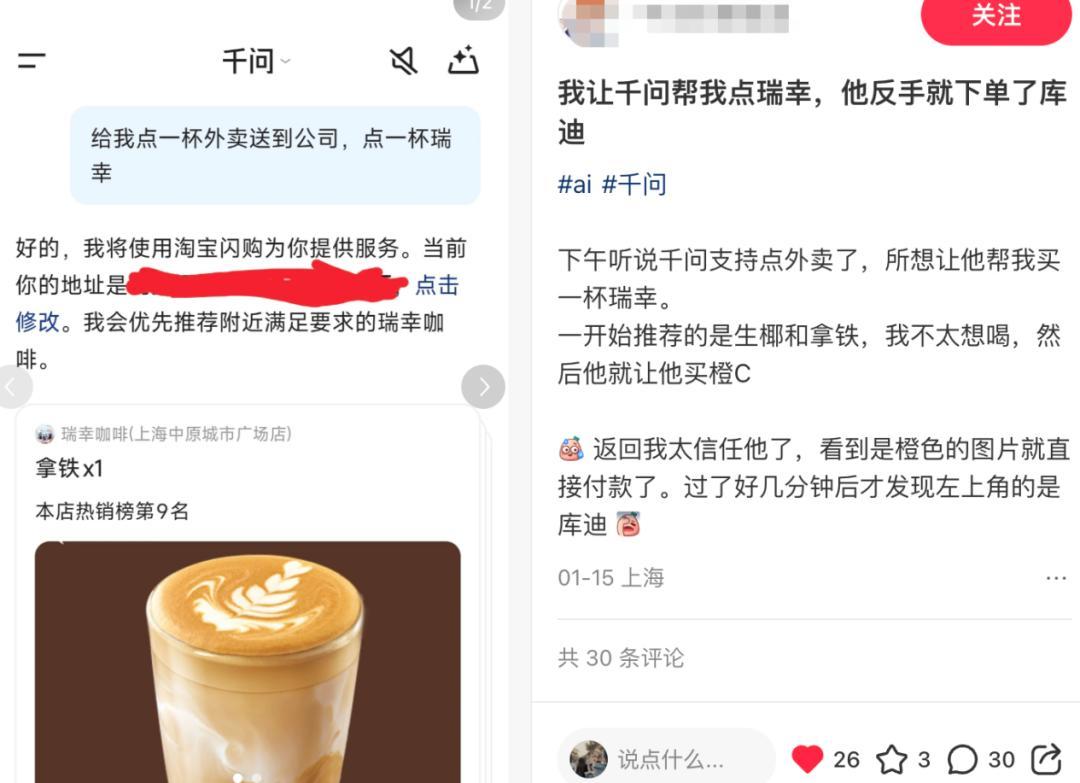更有網友吐槽稱,“我讓千問幫我點瑞幸,他反手就下單了庫迪,還是太信任它了”