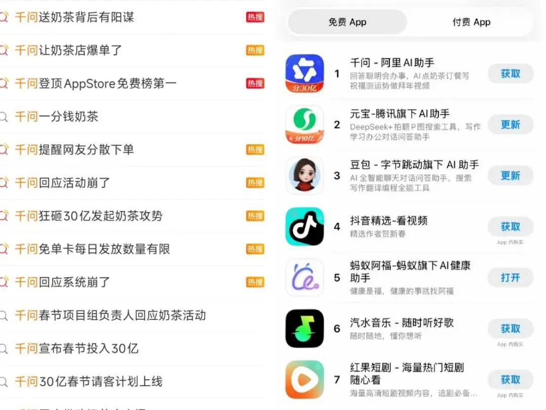 根據千問官方數據顯示,該活動上線9個小時,訂單量超過了1000萬單。霸榜多個微博熱搜同時,千問APP一度登頂AppStore免費下載榜榜首,超過前兩天狂撒10億紅包的騰訊元寶。