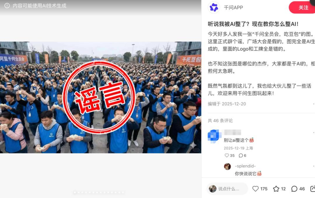 除了主動佈局娛樂營銷,千問還善於借梗營銷,將負面輿情轉化爲流量紅利。2025年年末,網絡流傳“千問大會手撕豆包”的AI梗圖,引發大衆熱議。千問官方快速闢謠,明確表示梗圖由自身生圖功能製作,既澄清了事實,又成功推廣了生圖功能,實現流量與口碑的雙重收穫。