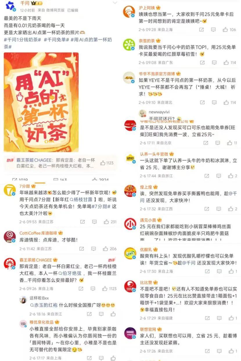 率先上線的20億免單活動集中引爆了輿論場,尤其以AI點奶茶、免單消費等場景,快速建立了“上千問,AI一鍵下單”的用戶心智。
