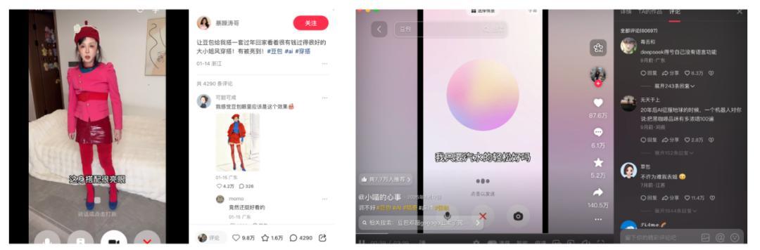擬人化 IP 極大激發了用戶二創熱情,有AI領域創作者表示,豆包的對話體驗更具“人味”,區別於其他工具類AI產品,更能滿足大衆的情感互動需求。抖音上 “調教豆包” 成爲熱門創作方向,網友自發打造 “豆沙” 等衍生 IP,逐步形成獨特的 “豆包 IP 宇宙”,用戶在互動分享中自發擴大傳播聲量。