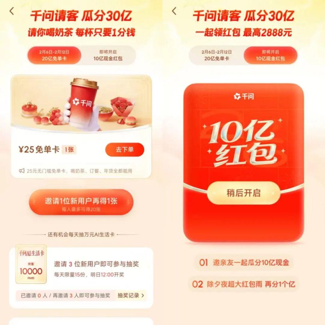 百度文心、騰訊元寶數十億紅包熱度未消,阿里千問再度加碼,以“30億春節請客計劃”刷新投入規模,其中20億免單卡、10億現金紅包,成爲今年大廠AI營銷戰中投入規模最高的玩家。