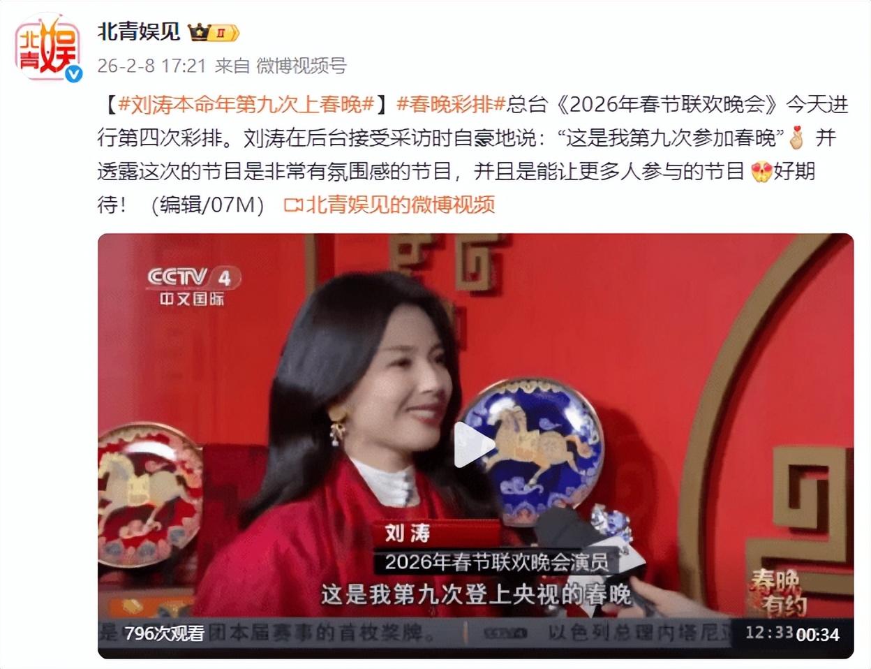 總檯《2026年春節聯歡晚會》今天進行第四次彩排。劉濤在後臺接受採訪時自豪地說:“這是我第九次參加春晚!”