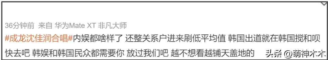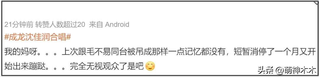 意料之外,情理之中地,沈佳潤這一次口碑大翻車。在“成龍沈佳潤合唱”的話題廣場中,大批網友吐槽沈佳潤是資源咖、關係戶。有人提起沈佳潤之前在跨年晚會上和毛不易合唱《不染》跑調、實力被吊打,指責她短暫消停一個月之後又開始出來蹦躂。