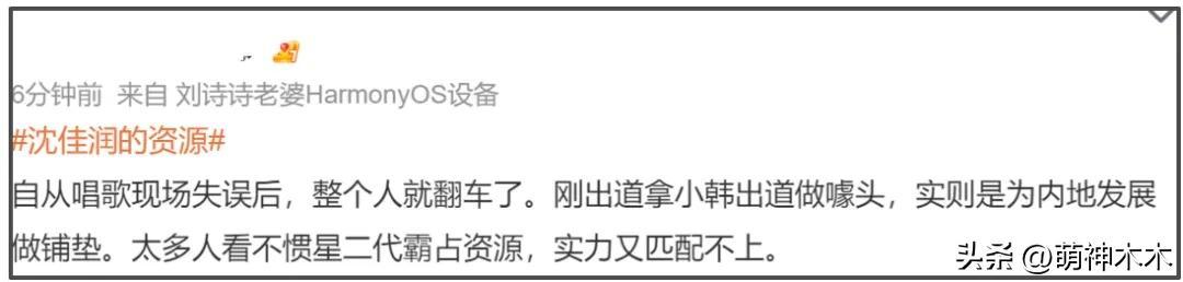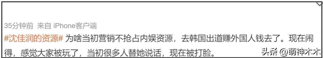 隨後,“沈佳潤的資源”這一話題登上了熱搜榜單。一方面,大家覺得沈佳潤作爲星二代霸佔許多好資源,實力卻匹配不上,讓人看不慣;另一方面,大家認爲當初沈佳潤在韓國出道,釋放出不搶佔內娛資源,去賺外國人錢的信號,現在卻頻繁在內娛活動,大家覺得被欺騙了,讓她去韓國攪合,放過內娛。