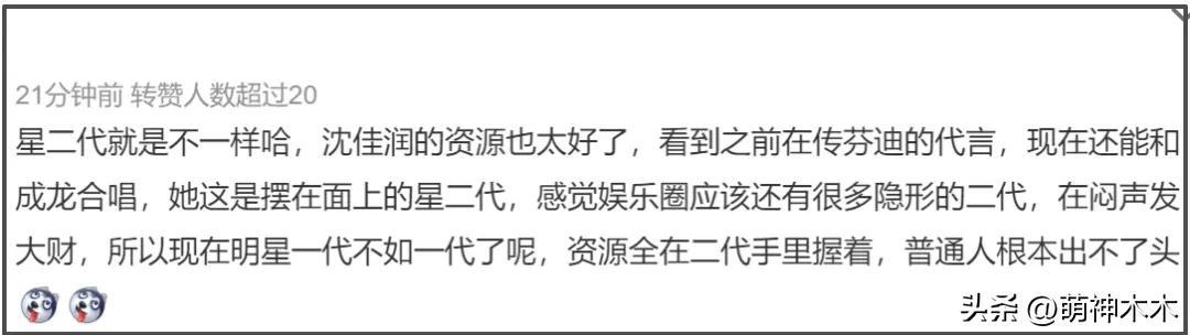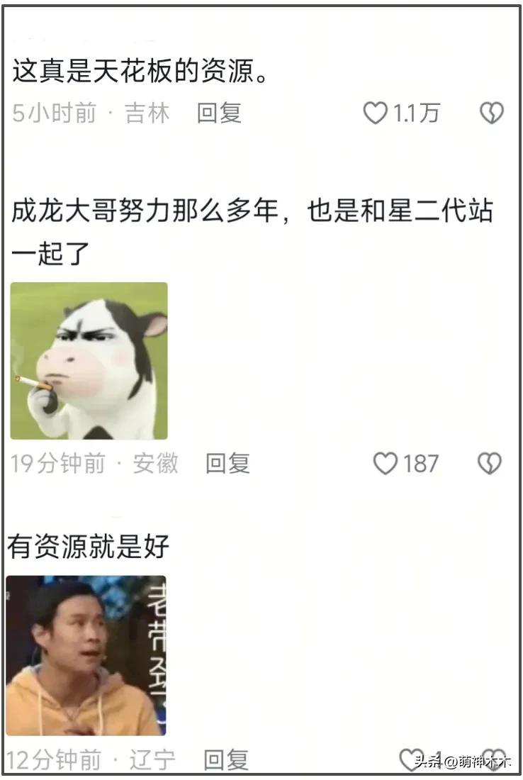 德不配位,卻依舊受到力捧的結果就是路人緣崩塌,全網口碑翻車。沈佳潤在某短視頻平臺發佈了和成龍合作的推廣曲片段,該視頻評論區前排淪陷。大家一邊感嘆着沈佳潤這“天花板的資源”,一邊陰陽怪氣地留言“成龍大哥努力那麼多年,也是和星二代站一起了”。