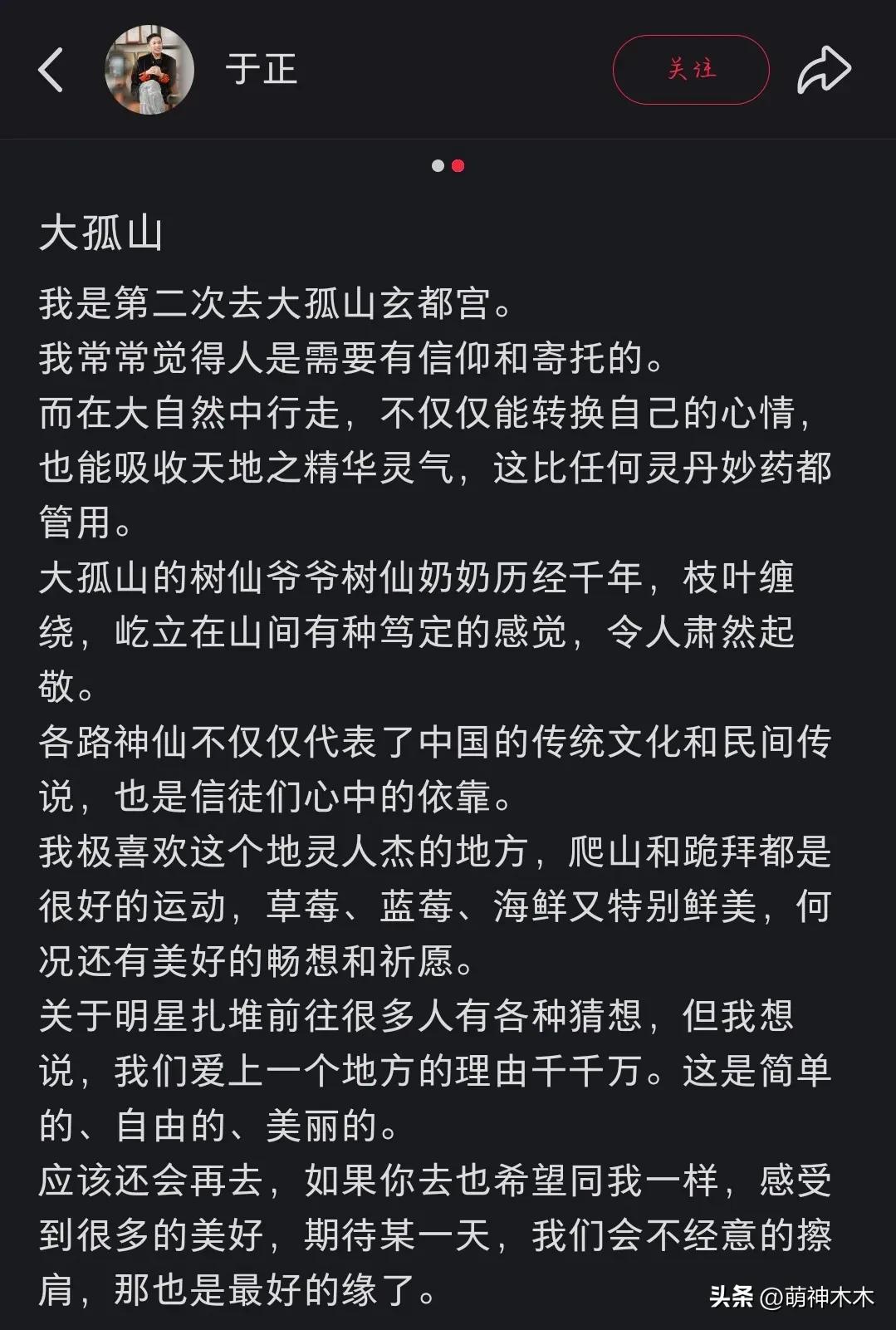 於正絕口不提玄都宮,只說大孤山的樹和空氣,表示自己把爬山、跪拜當運動,還誇大孤山的水果好喫,強調明星扎堆前往大孤山是去感受美好的。
