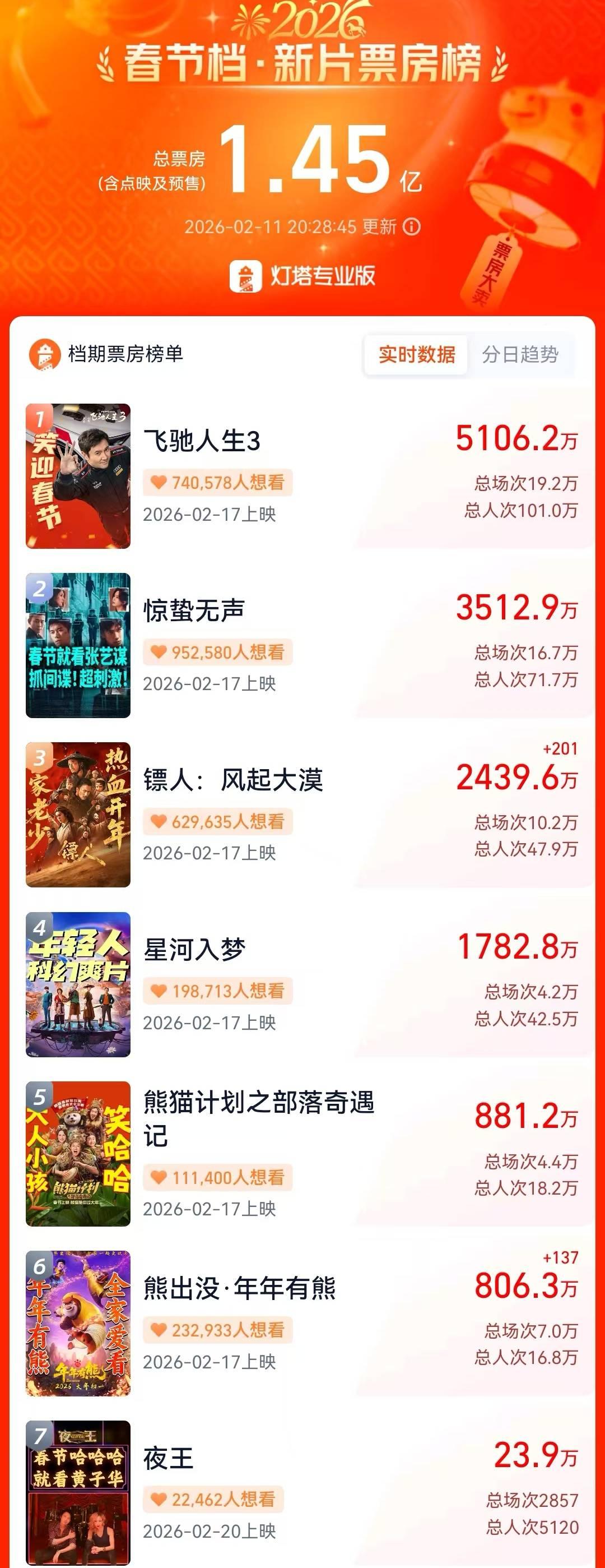 《驚蟄無聲》預售票房突破了3500萬元,暫居第二。《鏢人》預售票房突破了2400萬元,暫居第三。