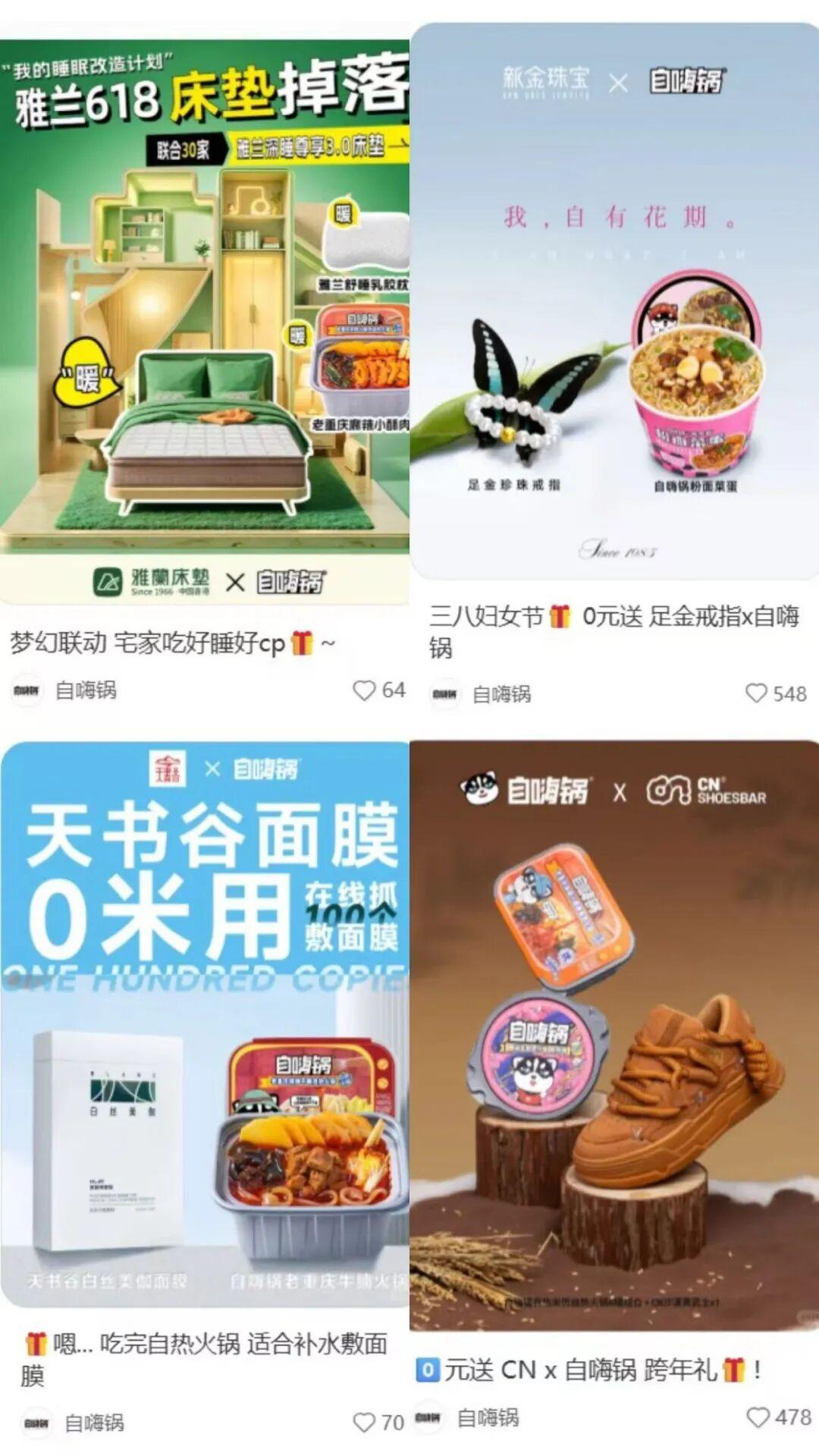 在消費選擇更多的情況下,砍掉了高額營銷代言的自嗨鍋卻沒有找到新的獨家優勢。原本,降價加聯名的組合拳在近年拯救了不少嘗試轉型的網紅品牌,但自嗨鍋的聯名活動卻顯得意義不明:近年來,自嗨鍋幾乎沒有出圈的IP聯名案例,只是不斷與實業品牌進行抽獎聯動。