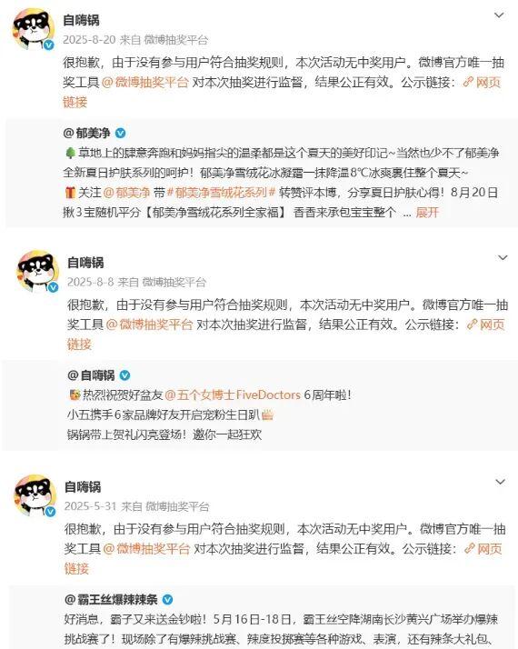 與面膜、牀墊、珠寶、鞋子、寵物食品等品牌進行跨界聯名未嘗不可,但沒能打出有記憶點的內容,也沒有新的玩法,自嗨鍋的聯名顯得是“爲聯而聯”。消費者也不甚買賬,自嗨鍋微博抽獎已經有連續多條出現無人中獎的狀況。