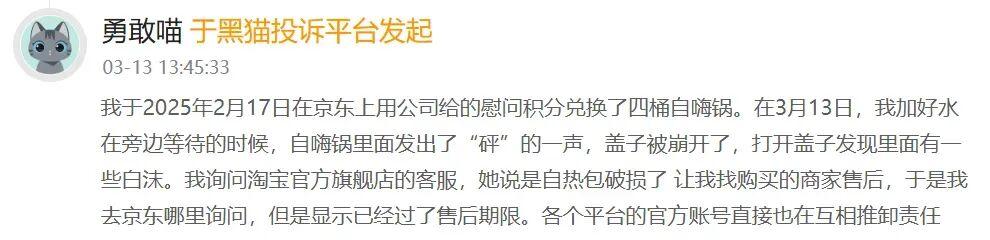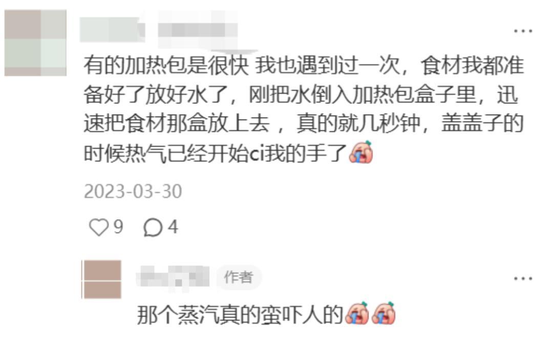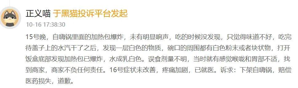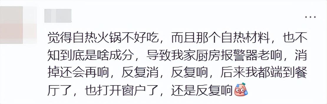 此外,還有不少人反映加熱過程中很容易引發煙霧報警。加熱包自身也存在安全隱患,黑貓投訴平臺上有大量加熱包自爆,內容物隨水蒸氣混入食品的客訴案例。人們爲年輕、潮流、便捷的都市生活幻想而買單,問題重重的生石灰加熱包卻告訴他們,他們買到的仍然是數年來毫無改進的原始加熱方案。這是自嗨鍋渴望籠絡的客羣們無法接受的。