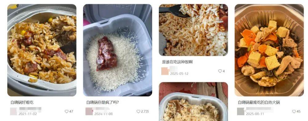 社交媒體上充滿了對自嗨鍋的吐槽:火鍋油膩但食材不入味、自熱米飯的米口感像塑料、脫水蔬菜又幹又癟、包裝又大又沉但能喫的分量極少……