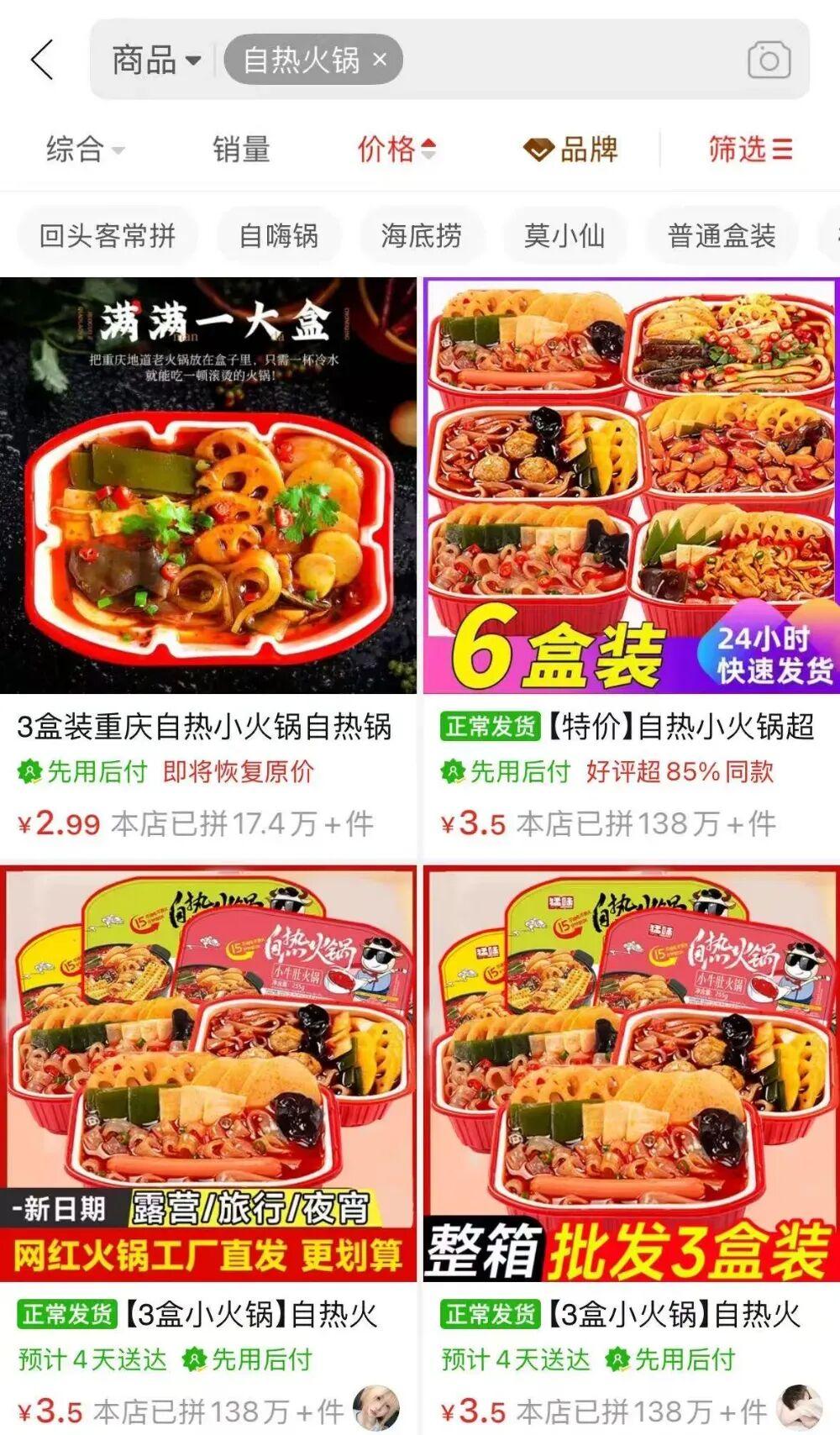 自嗨鍋的困境幾乎是自熱火鍋賽道共同的縮影。如今,拼多多等電商平臺上充斥着3-5元的白牌自熱火鍋,由於不必進行品牌建設,能夠最大限度地將資金投入進行薄利多銷的價格戰。這個幾乎沒有准入門檻,剛需場景也不豐富的品類,在資本將概念故事講盡又拋棄,品牌紛紛大撤退之後,成爲了最適合白牌生長的領地。