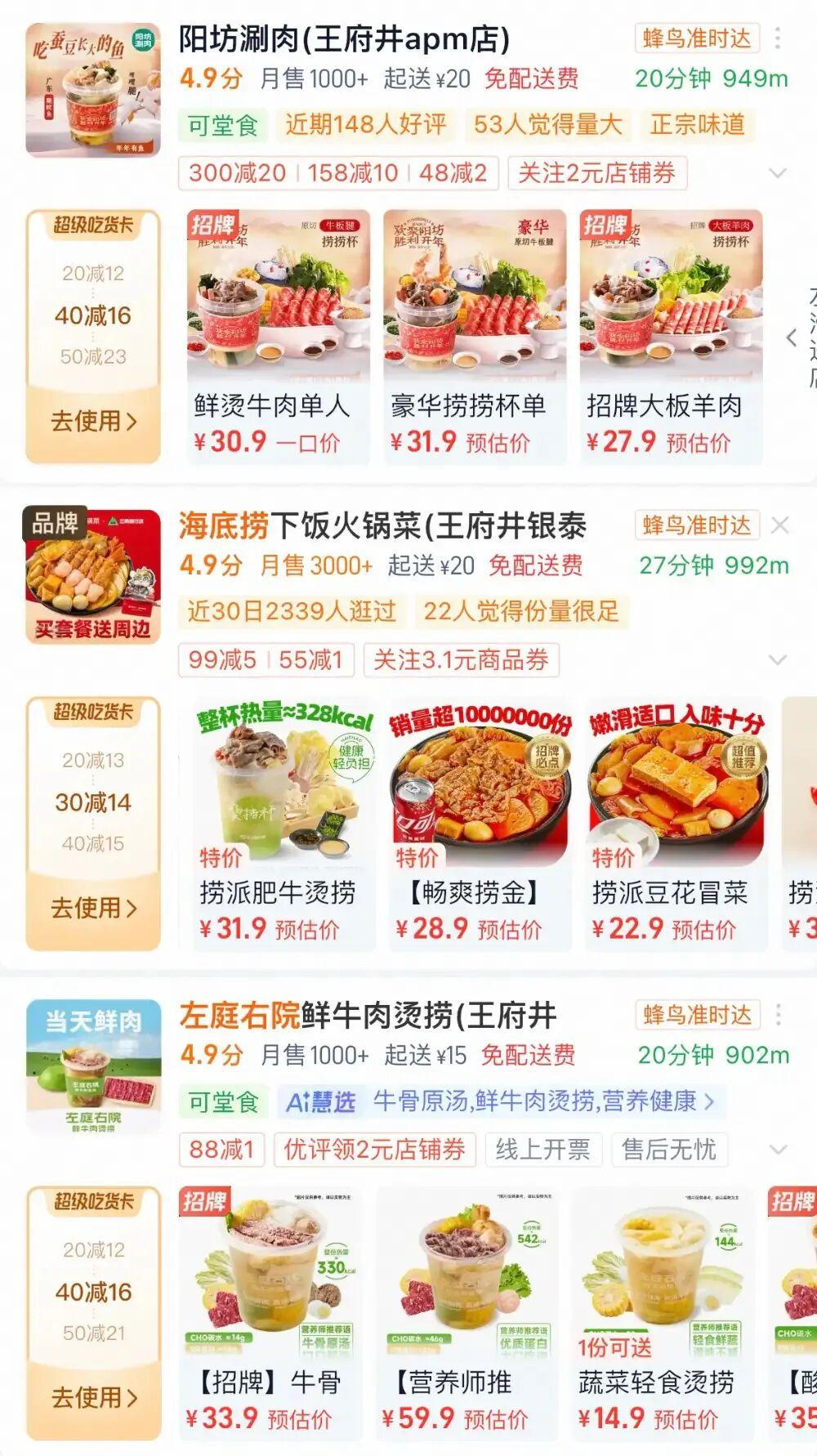 從自熱火鍋流出的需求,轉入了不同的產品形態:人們可以在外賣點一份火鍋門店出品的冒菜、燙撈杯或麻辣燙,也可以直接在超市下單快手菜配送到家,甚至能夠選擇從湯底到蘸料都打包配好的整份火鍋,人均也不過20-40元。