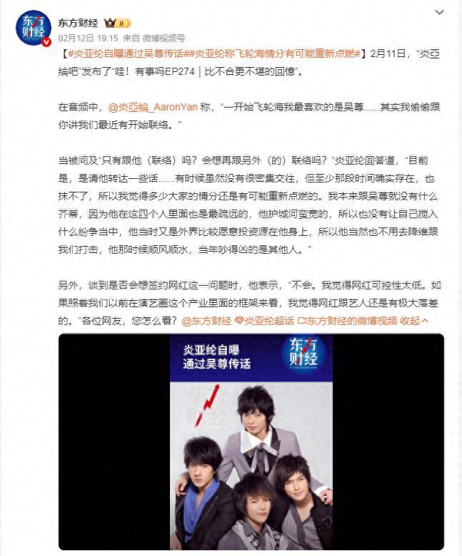 2月11日,炎亞綸在音頻中聊到飛輪海,他稱“一開始飛輪海我最喜歡的是吳尊......其實我偷偷跟你講我們最近有開始聯絡。”