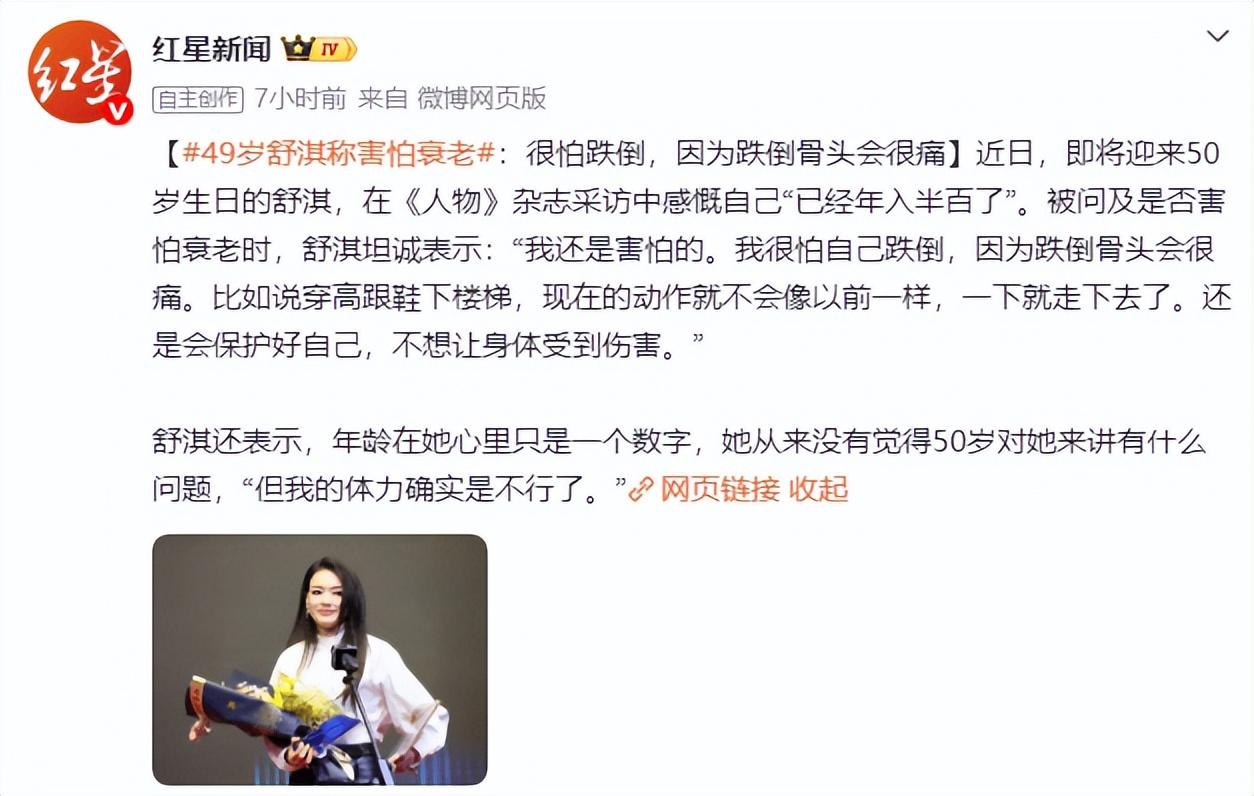 近日,即將迎來50歲生日的舒淇,在《人物》雜誌採訪中感慨自己“已經年入半百了”。被問及是否害怕衰老時,舒淇坦誠表示:“我還是害怕的。我很怕自己跌倒,因爲跌倒骨頭會很痛。比如說穿高跟鞋下樓梯,現在的動作就不會像以前一樣,一下就走下去了。還是會保護好自己,不想讓身體受到傷害。”
