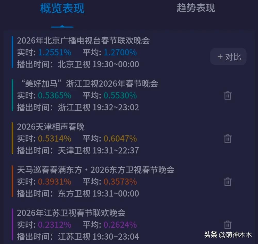 其中遼寧衛視春晚屬於重播,河南衛視、山東衛視春晚分別是雜技和戲曲主題,受衆面不大,就不納入比拼了,真正的衛視春晚收視大戰還是要看六位老朋友。