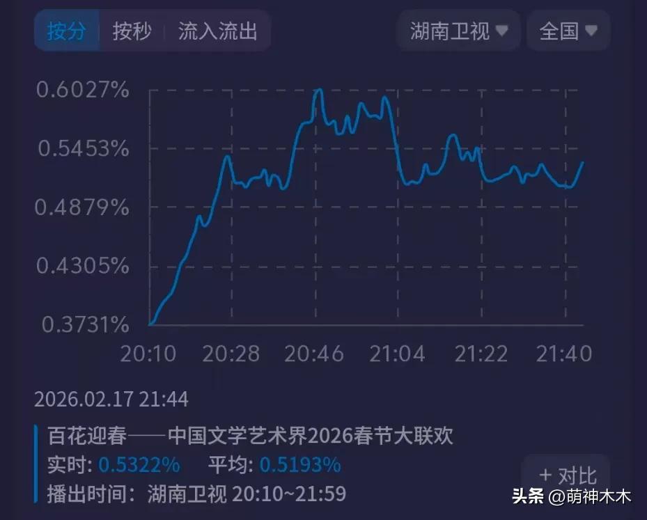 百花迎春文聯春晚堪稱文藝界規模最大的晚會,放眼望去,白髮蒼蒼的老戲骨坐在臺下,屬於行業內聯歡晚會,節目質量也很不錯,就是和湖南臺風格不太適配,但平均收視也有0.5%,最高點破了0.6%,比江蘇臺、東方臺都要高,不愧是湖南臺,收視底盤夠大。