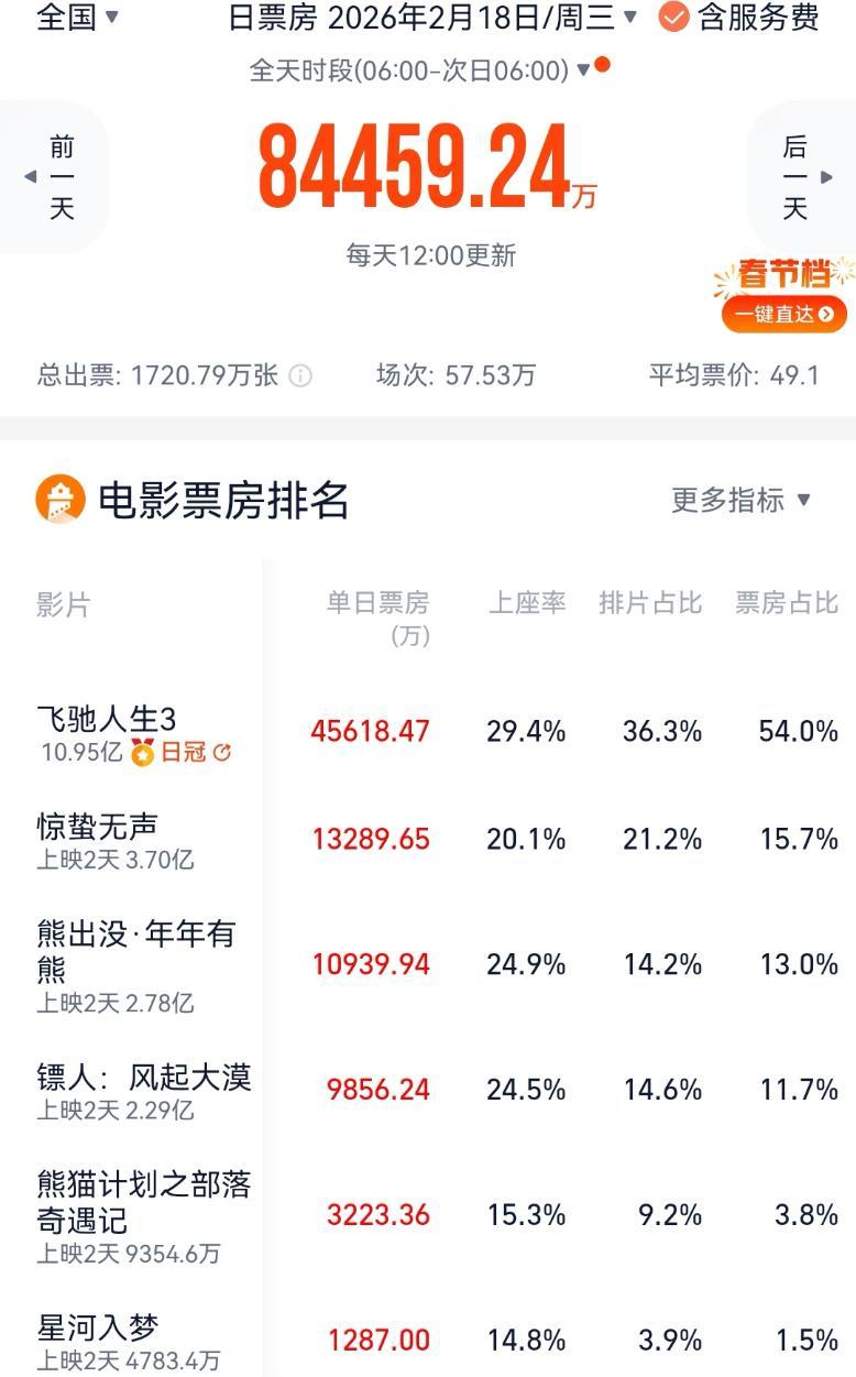 韓寒的《飛馳人生3》上映2天票房10.95億元,加上此後的預售,累計票房突破了12億元。該片豆瓣評分、排片佔比、上座率都是今年春節檔第一,貓眼專業版、燈塔專業版預測其最終總票房分別爲40億元、42億元。