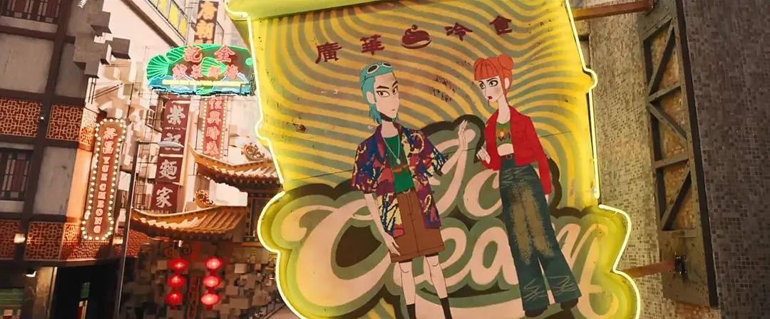 電影中確實有一些不錯的橋段,比如男女主穿越進入霓虹燈牌,從三維“降維”成剪影式的二維紙片人;又如餐廳那段融入像素效果的慢動作打戲。