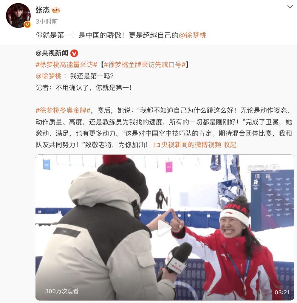 搜狐娛樂訊 19日,張傑在社交平臺上發文祝賀恭喜徐夢桃奪得金牌,他表示:“你就是第一!是中國的驕傲!更是超越自己的@徐夢桃!”據悉,北京時間2月18日,在米蘭-科爾蒂納冬奧會自由式滑雪女子空中技巧決賽中,中國選手徐夢桃奪得金牌。