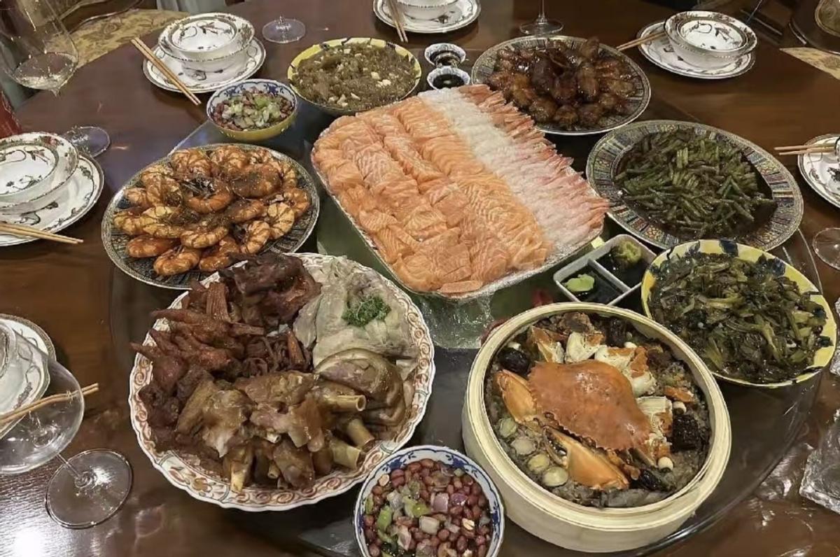桌子中央擺着滿滿一大盆海鮮刺身,三文魚片和甜蝦都快要溢出來,這餐標放到普通人家裏算得上豪華了。