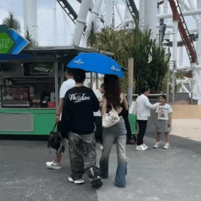 看互動,兩人面對面的時候,黃曉明和美女正準備輪替接傘,黃曉明另一隻手上還拿着飲料。