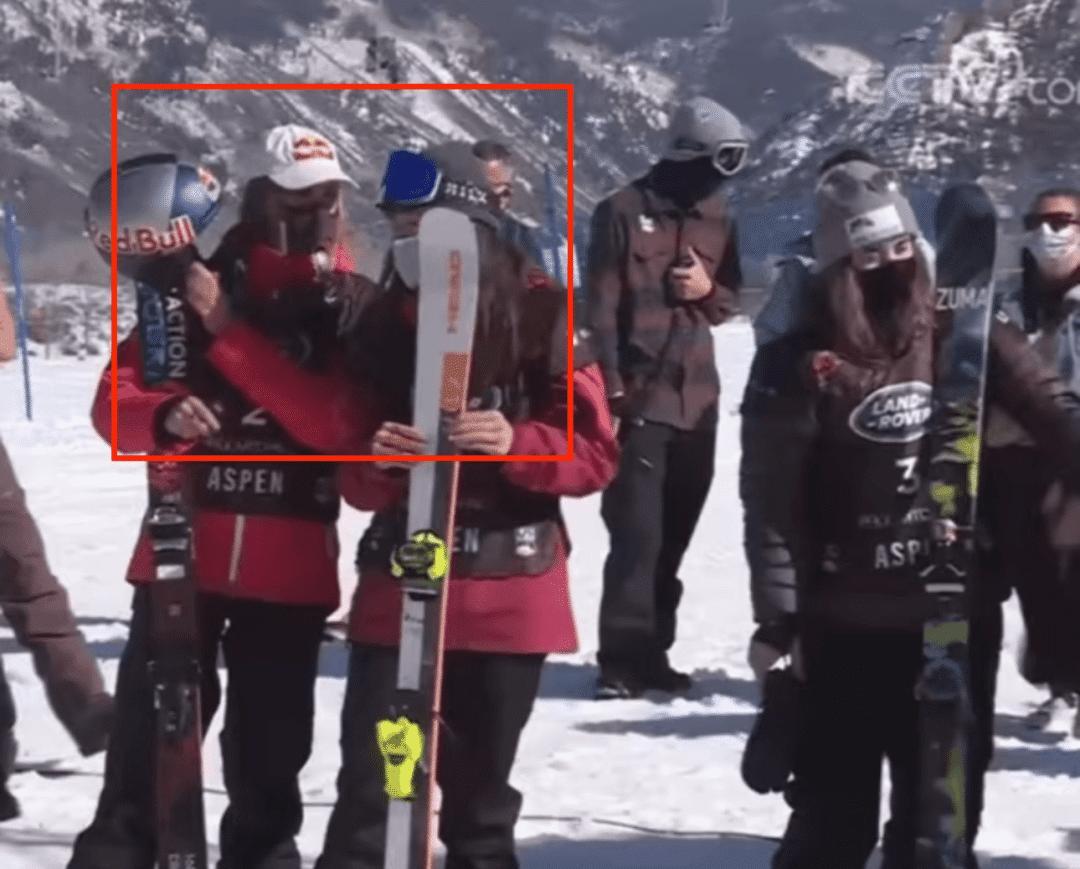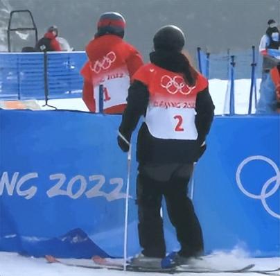 當時谷愛凌的身體明顯傾向另一個運動員,和這次米蘭如出一轍